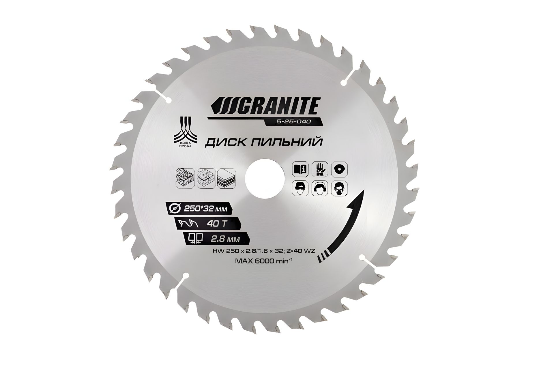 Диск пильний для дерева з твердосплавними напайками 250х32х40Т адаптер 32-30/32-25.4 6100 об/хв MASTERTOOL 5-25-040 професійний