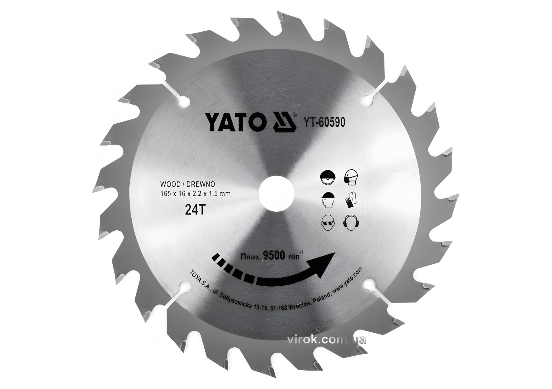 Диск пильний победітовий по дереву YATO: 165x16x2.2x1.5 мм, 24 зубці, RP M до 9500 1/хв