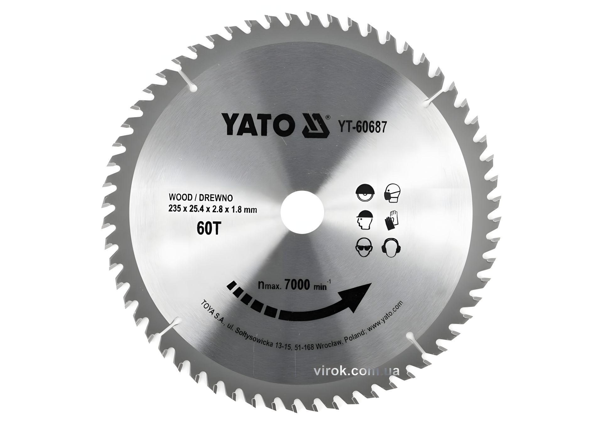 Диск пильний победітовий по дереву YATO: 235x25.4x2.8x1.8 мм, 60 зубів, RP M до 7000 1/хв