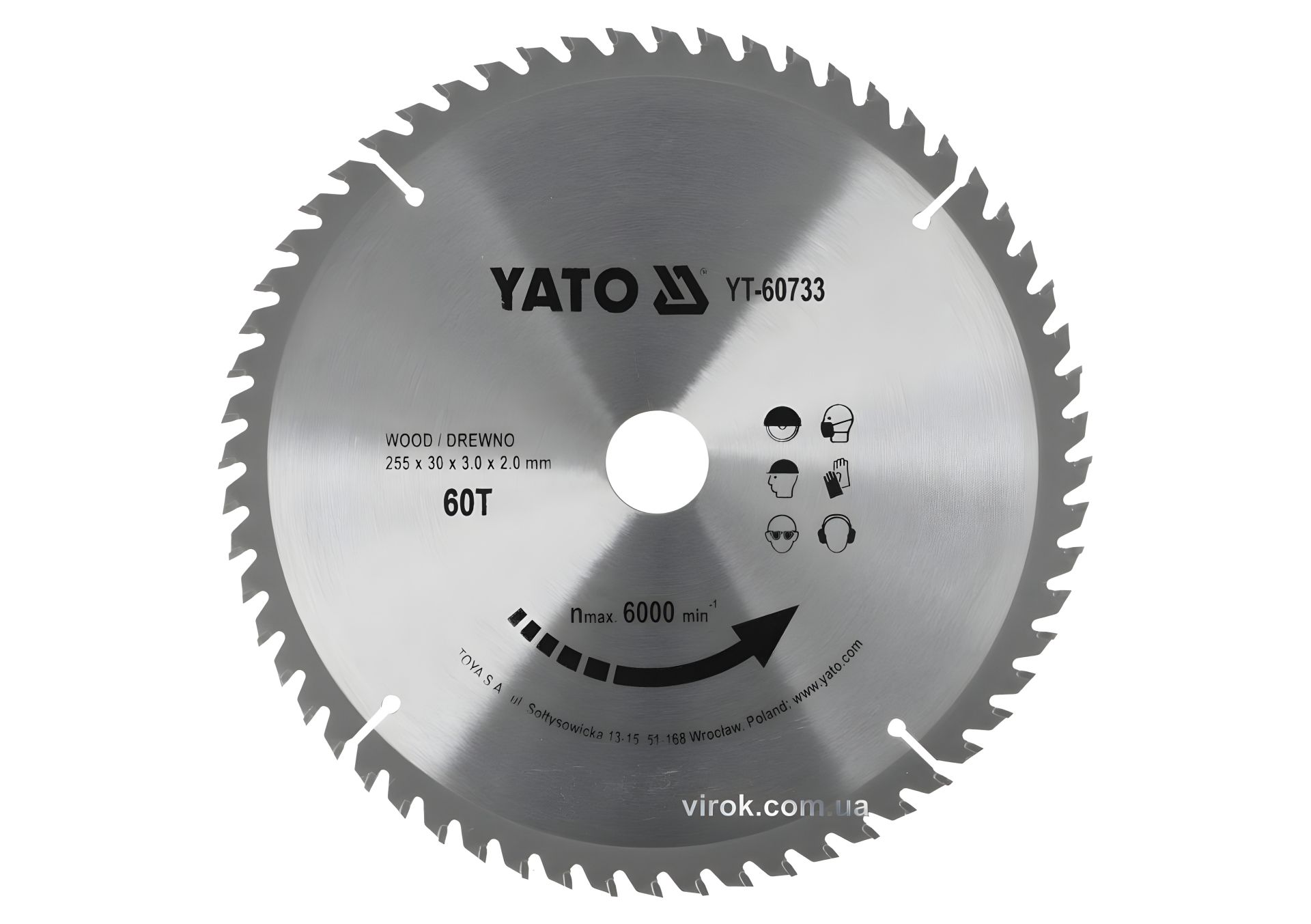 Диск пильний победітовий по дереву YATO: 255x30x3.0x2.0 мм, 60 зубів, RP M до 6000 1/хв
