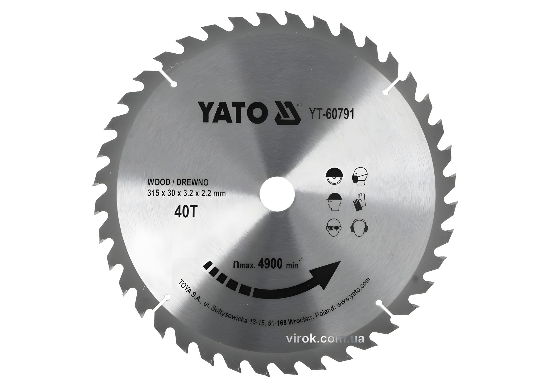 Диск пильний победітовий по дереву YATO: 315x30x3.2x2.2 мм, 40 зубців, RP M до 4900 1/хв