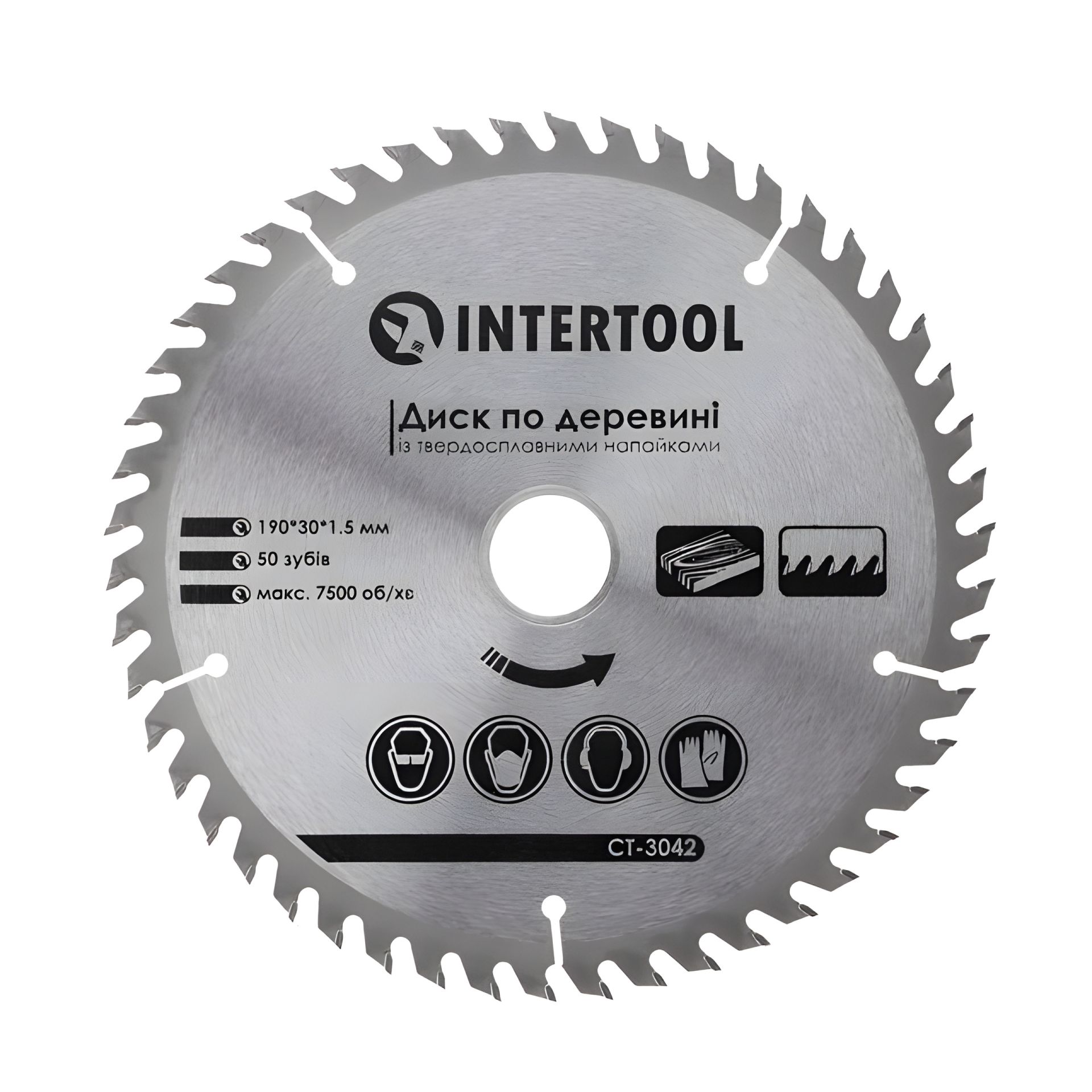 Диск для дерева, з твердосплавними напайками, 190×30×1,5 мм, 50 зубів, 7500 об/хв INTERTOOL CT-3042