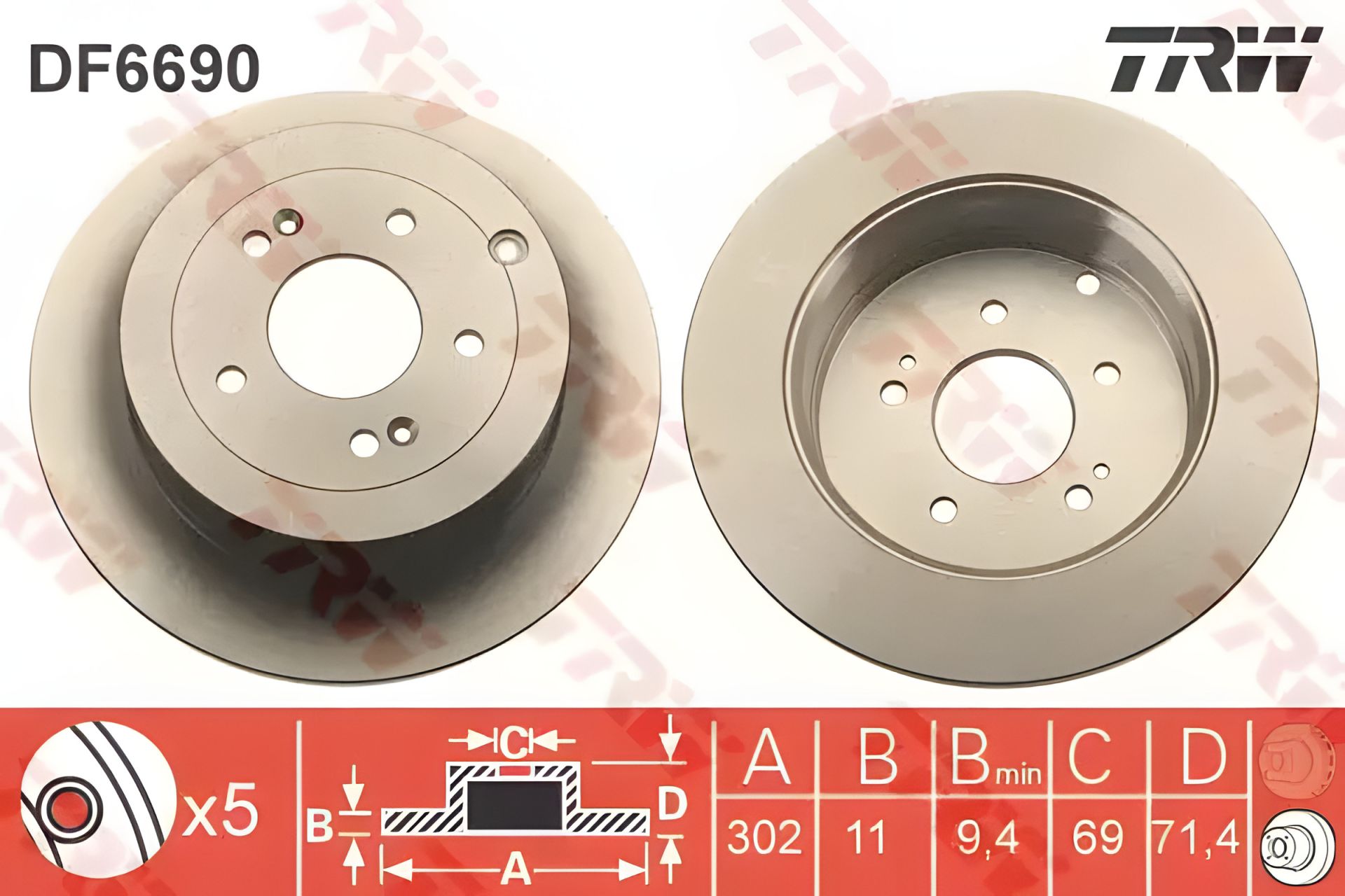 Гальмівний диск (1 шт.) R D=302mm 06-11 HYUNDAI Santa Fe, TRW (DF6690)