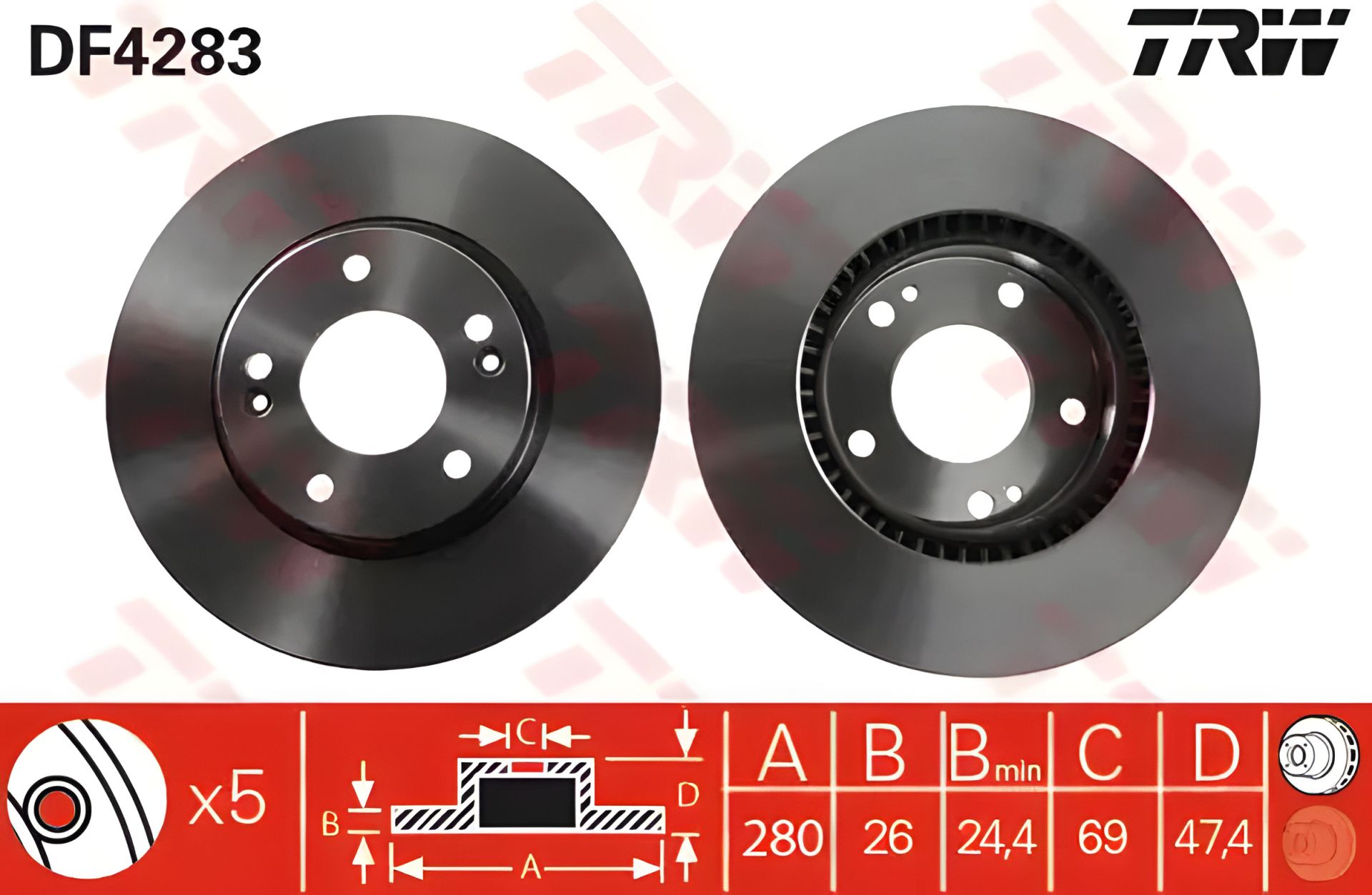 Передній гальмівний диск Ceed/Carens III/Magentis/Sportage/Tucson 04- (280x26), TRW (DF4283)