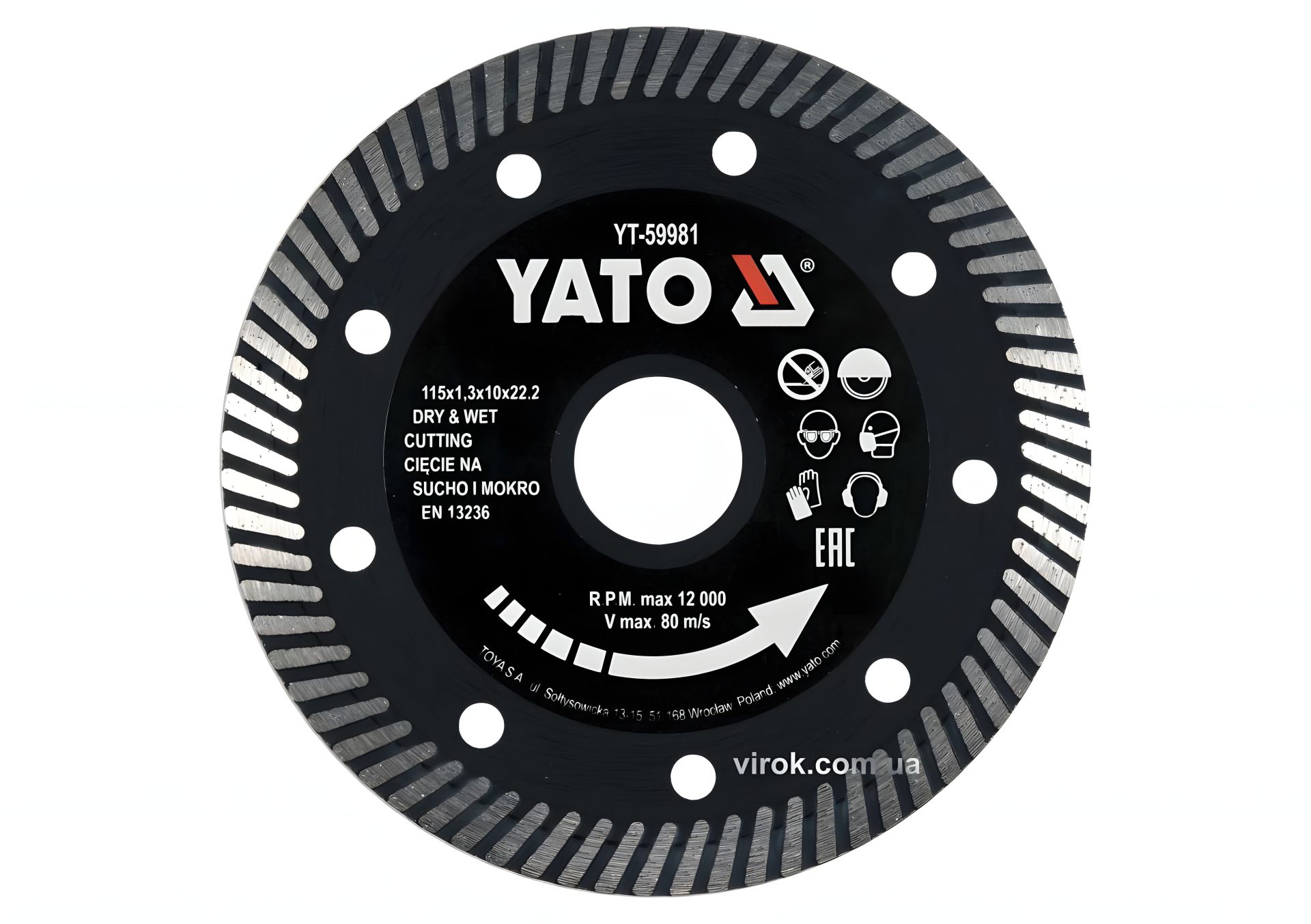 Диск відрізний алмазний по гресу та кераміці "TURBO" YATO Ø=115x1.3x10x22.2 мм, в мокрому режимі
