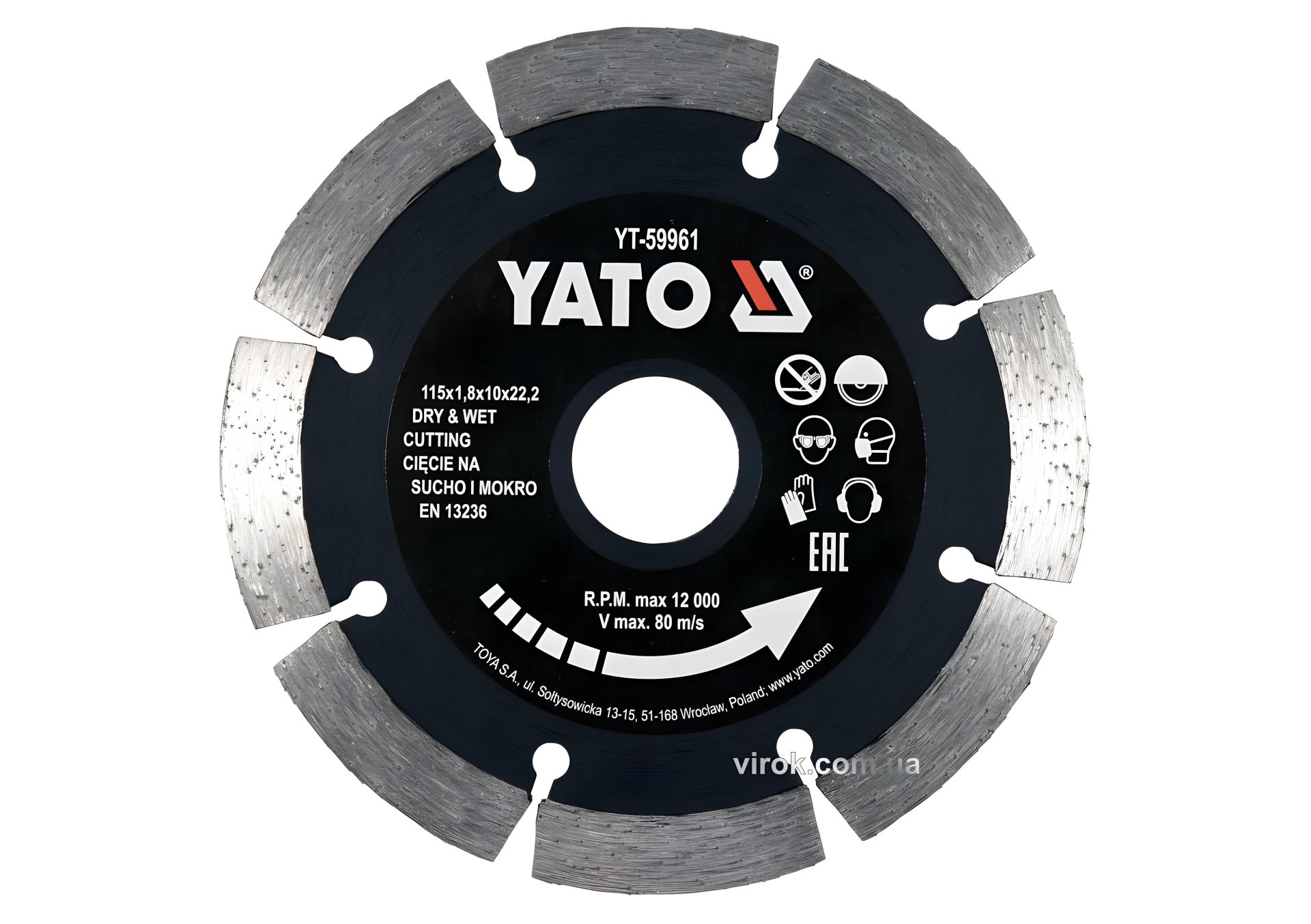 Диск відрізний алмазний по каменю та бетону YATO Ø=115x1.8x10x22.2 мм, в мокрому та сухому режимі