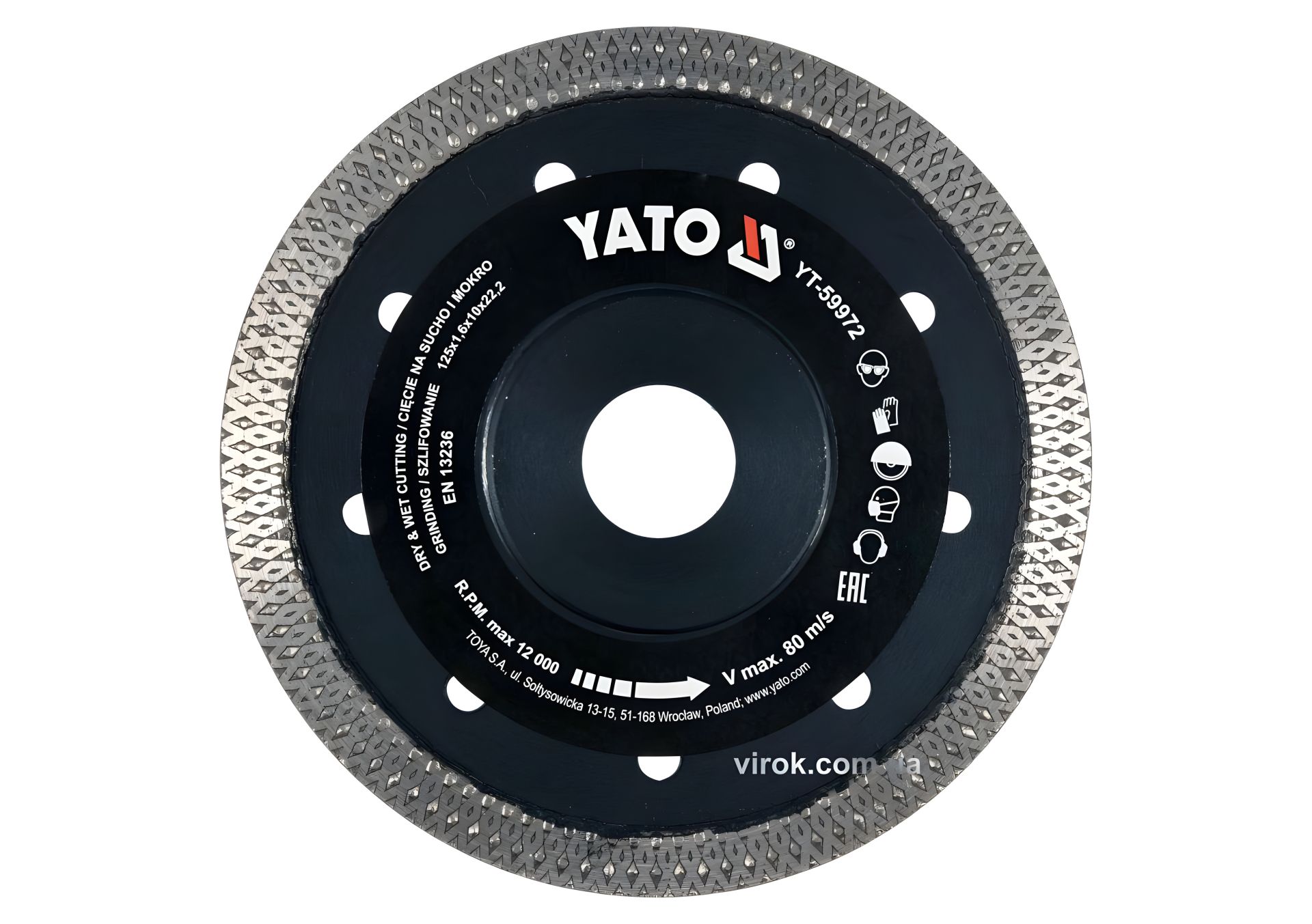 Диск відрізний алмазний за гресом, склом, керамікою YATO Ø=125x1.6x10x22.2 мм, в сухому режимі