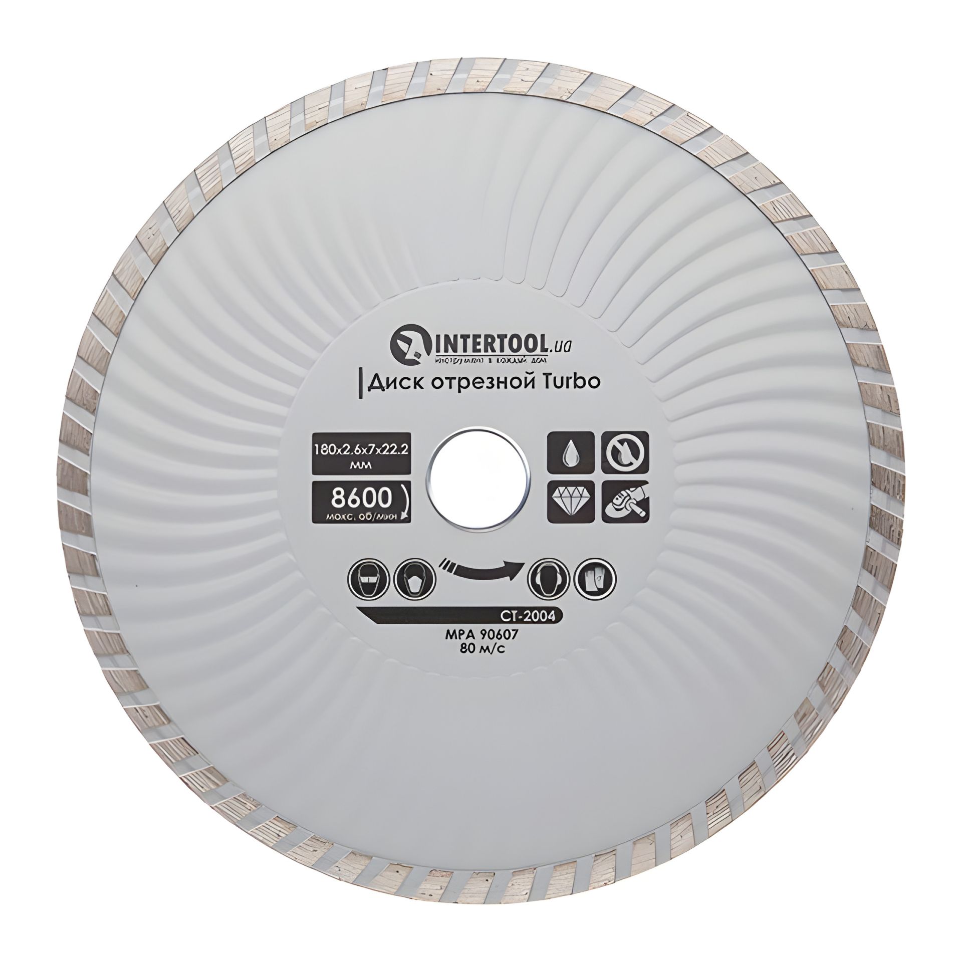 Алмазний відрізний диск TURBO INTERTOOL CT-2004, діаметром 180 мм, призначений для використання з кутовими шліфувальними машинами з високою швидкістю обертання, а також з бензиновими ручними відрізними машинами.