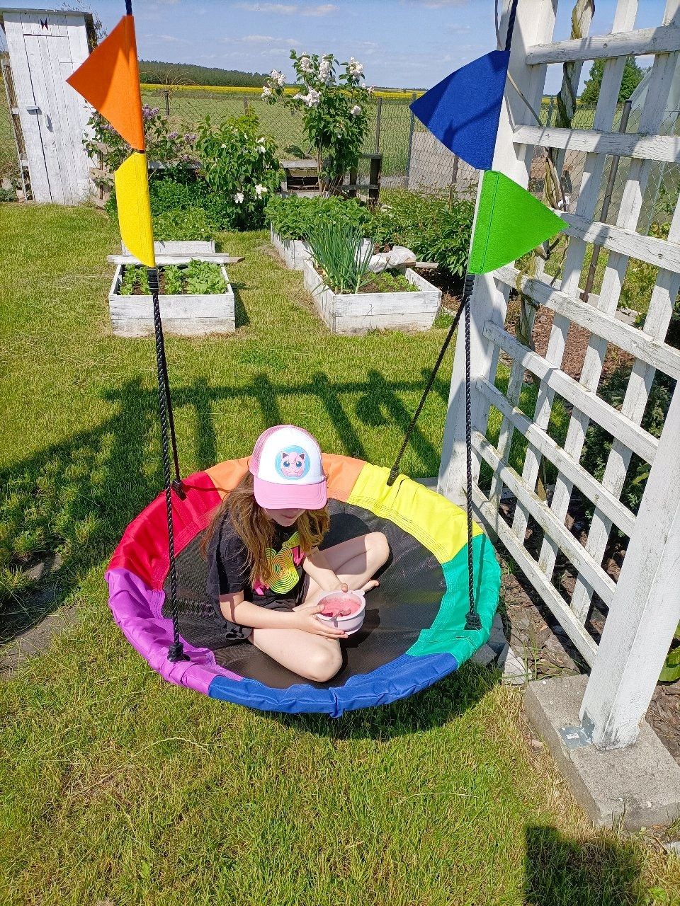- РЕГУЛЮВАННЯ ВИСОТИ - гойдалки мають можливість регулювання мотузки, максимальна довжина становить 150 см. Завдяки цьому гойдалки підійдуть як маленьким (заниженими в зростанні), так і більш дорослим дітям. Це полегшує безпечний вхід і вихід. Міцні плетені мотузки товщиною 10 мм дозволяють не турбуватися про дітей, граючи на гойдалках.