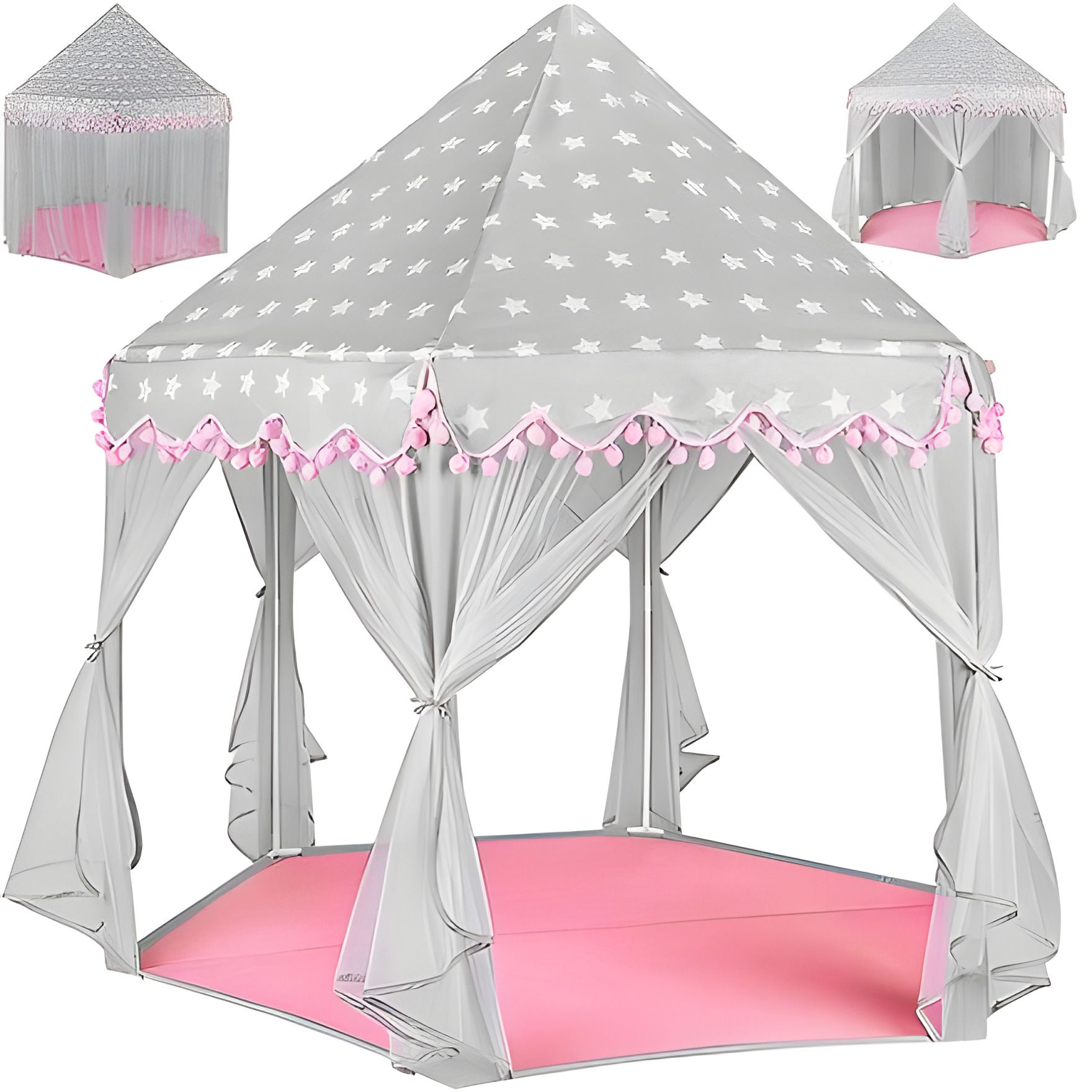 НОВА ПОКРАЩЕНА МОДЕЛЬ — ми створили абсолютно нову, поліпшену модель намету. Ми використовували поєднання рожевого та сірого із зоряним мотивом. Крім того, на оборках є гарні помпони, які роблять його ще привабливішим. Намет має 6 вхідних отворів і конічний дах. Все має фантастичний вигляд і чудово впишеться в будь-яку кімнату.