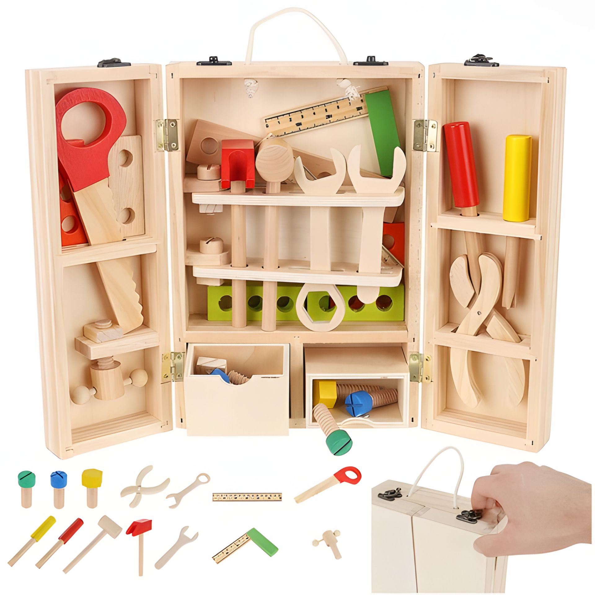 - ЯЩИК ДЛЯ ІНСТРУМЕНТІВ — у комплект входить ящик і аксесуари, як-от: гвинти, гайки, пила, молотки, дошки з отворами, викрутки, плоскогубці, лінійка та кутовий кутовий кут. Скринька також має зручну ручку з товстої мотузки. Усередині коробки є безліч відділень і місць для розміщення всіх інструментів. Іграшка виготовлена з дерева та розкрита фарбою, безпечною для здоров'я малюка.