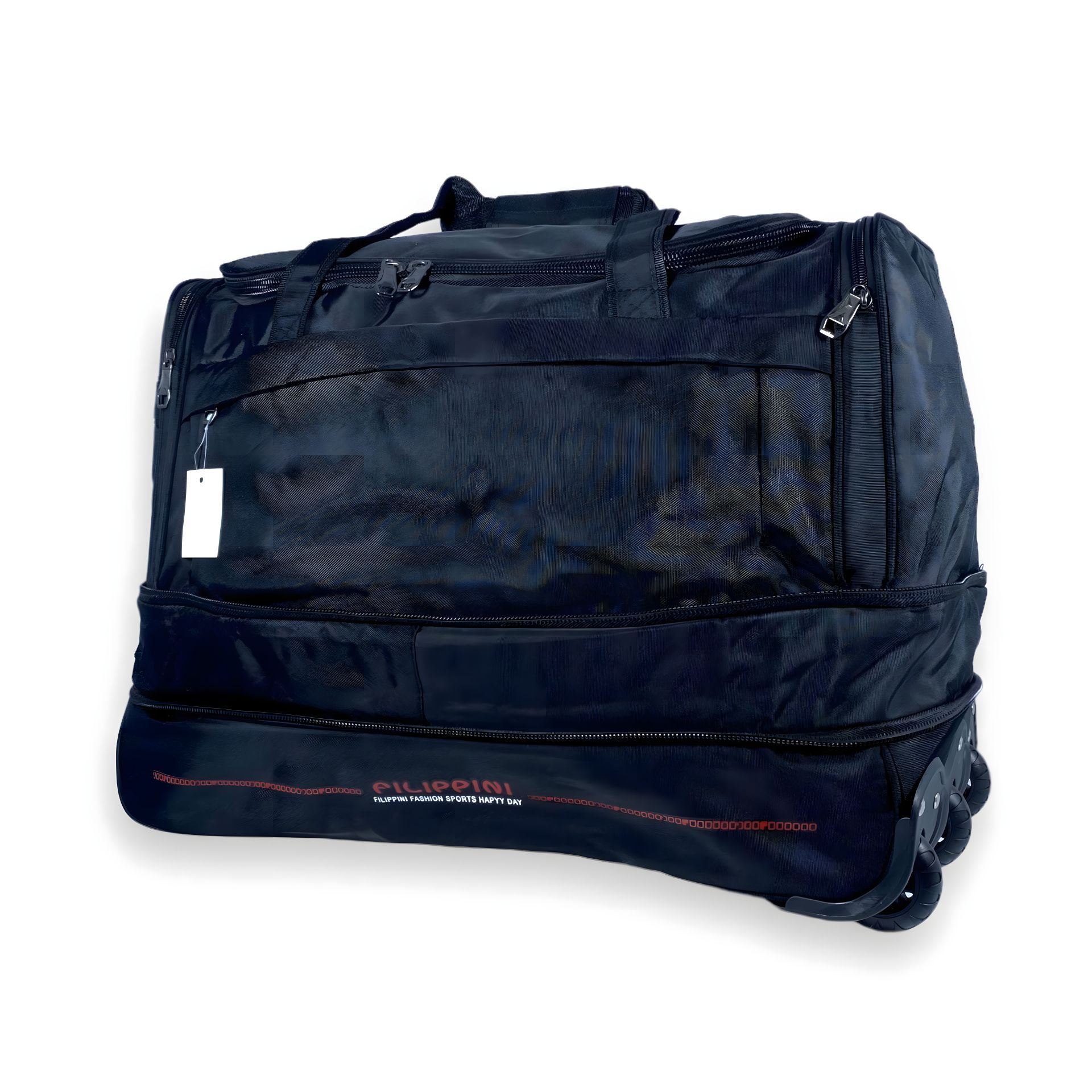 Сумка на колесах, практичний спосіб перевезення великої кількості речей. Завдяки рухомим коліщаткам - сумку легко переміщати асфальтом, в аеропорту або на вокзалі. Головною перевагою цієї моделі є можливість розширення розміру до 7 см, за рахунок додаткової блискавки, яка знаходиться у нижній частині сумки. Сумка має одне просторе відділення та дві додаткових кишені по боках. На лицевій стороні розташована містка кишеня на блискавці. Три коліщатка на жорсткому каркасі, телескопічна ручка, тканинні ручки додають зручності та комфорту в транспортуванні. Максимальна довжина телескопічної ручки 35 см. Матеріал міцний, добре прошитий, витримує великі навантаження і має вологовідштовхувальні властивості.