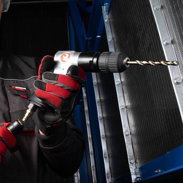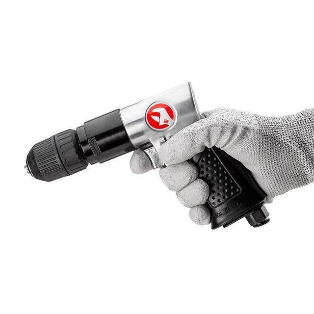 Компактний та легкий алюмінієвий корпус забезпечує високу маневреність та можливість роботи однією рукою. Кнопки керування комфортно розташовані під пальцями, дуже зручно працювати інструментом під час свердління серійних отворів. Гумова рукоятка забезпечує надійний хват при роботі. Латунний фітинг для простого підключення дриля до пневмосистеми.