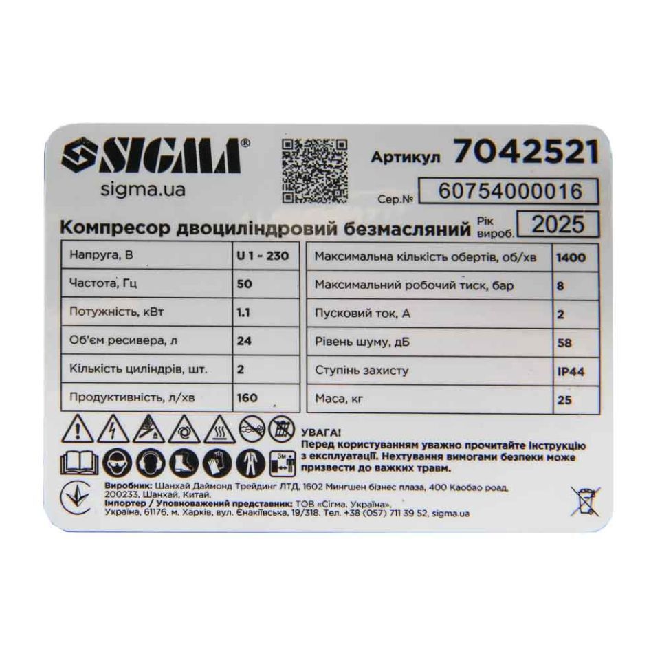 Компресор двоциліндровий безмасляний 1.1кВт 1400об/хв 160л/хв 8бар 58дБ 24л SIGMA 7042521