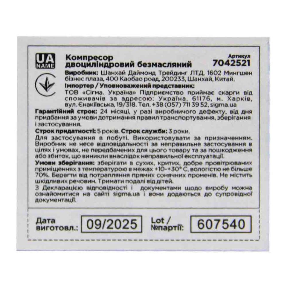Компресор двоциліндровий безмасляний 1.1кВт 1400об/хв 160л/хв 8бар 58дБ 24л SIGMA (7042521) призначений для нагнітання стиснутого повітря з подальшою подачею під тиском в різні типи пневмоінструменту.