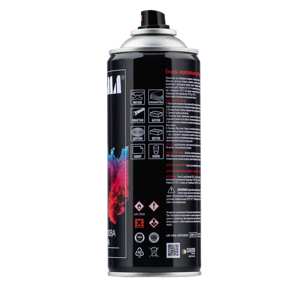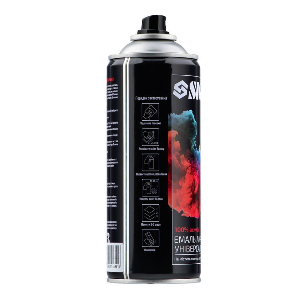 100% акрилова, швидковисихаюча аерозольна емаль з прекрасною адгезією до більшості поверхонь, таких як метал, бетон, дерево, скло, пластик, гіпсокартон та інші матеріали.