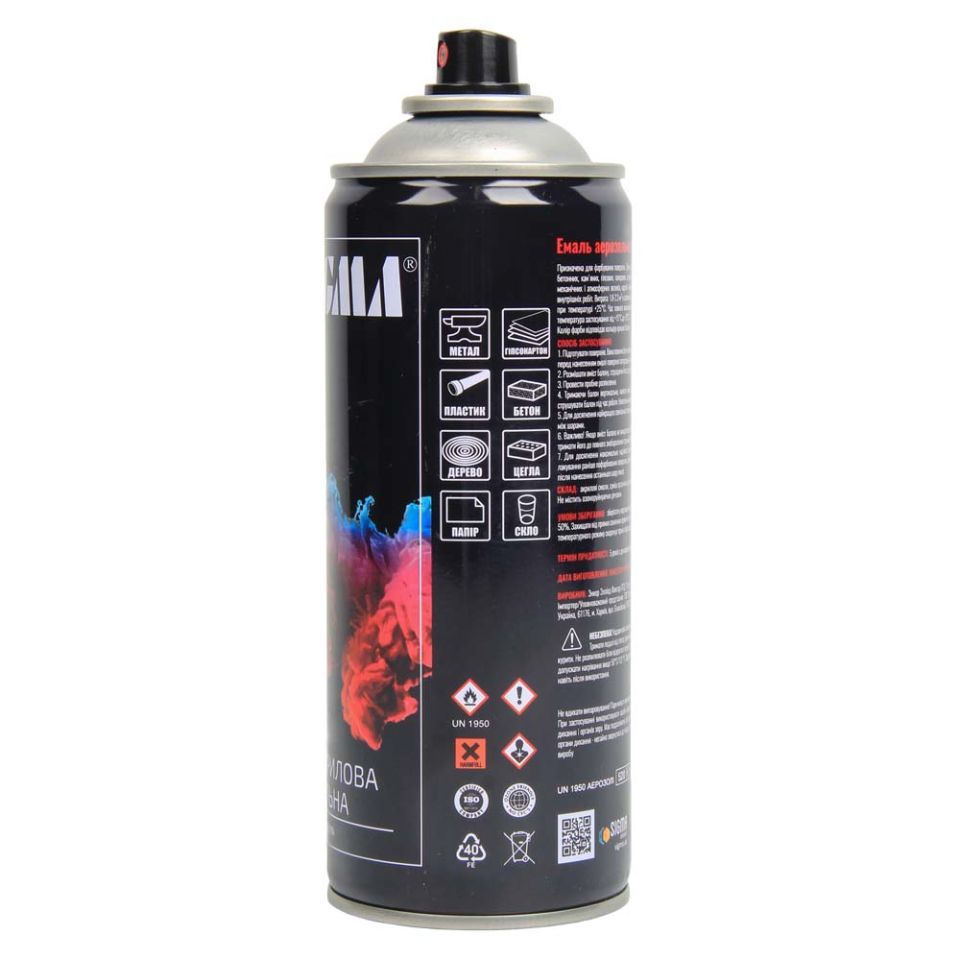 100% акрилова, швидковисихаюча аерозольна емаль з прекрасною адгезією до більшості поверхонь, таких як метал, бетон, дерево, скло, пластик, гіпсокартон та інші матеріали.