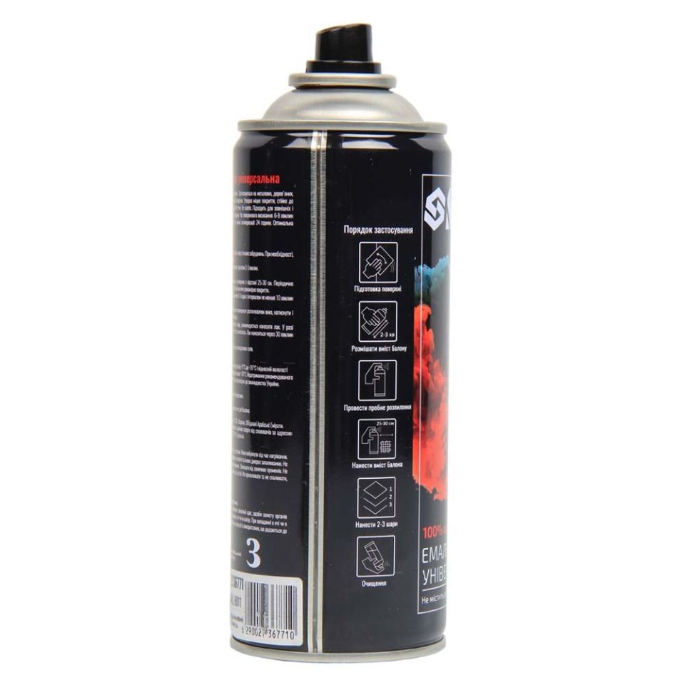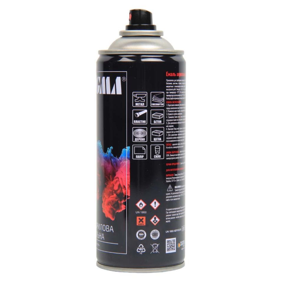 100% акрилова, швидковисихаюча аерозольна емаль з прекрасною адгезією до більшості поверхонь, таких як метал, бетон, дерево, скло, пластик, гіпсокартон та інші матеріали.