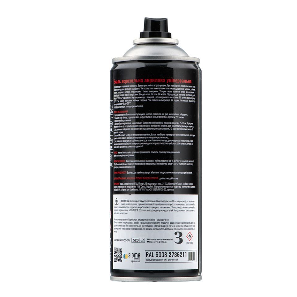 Емаль аерозольна флуоресцентна акрилова 400мл RAL 6038 зелений SIGMA (2736211) - 100% акрилова, швидковисихаюча аерозольна емаль з прекрасною адгезією до більшості поверхонь.