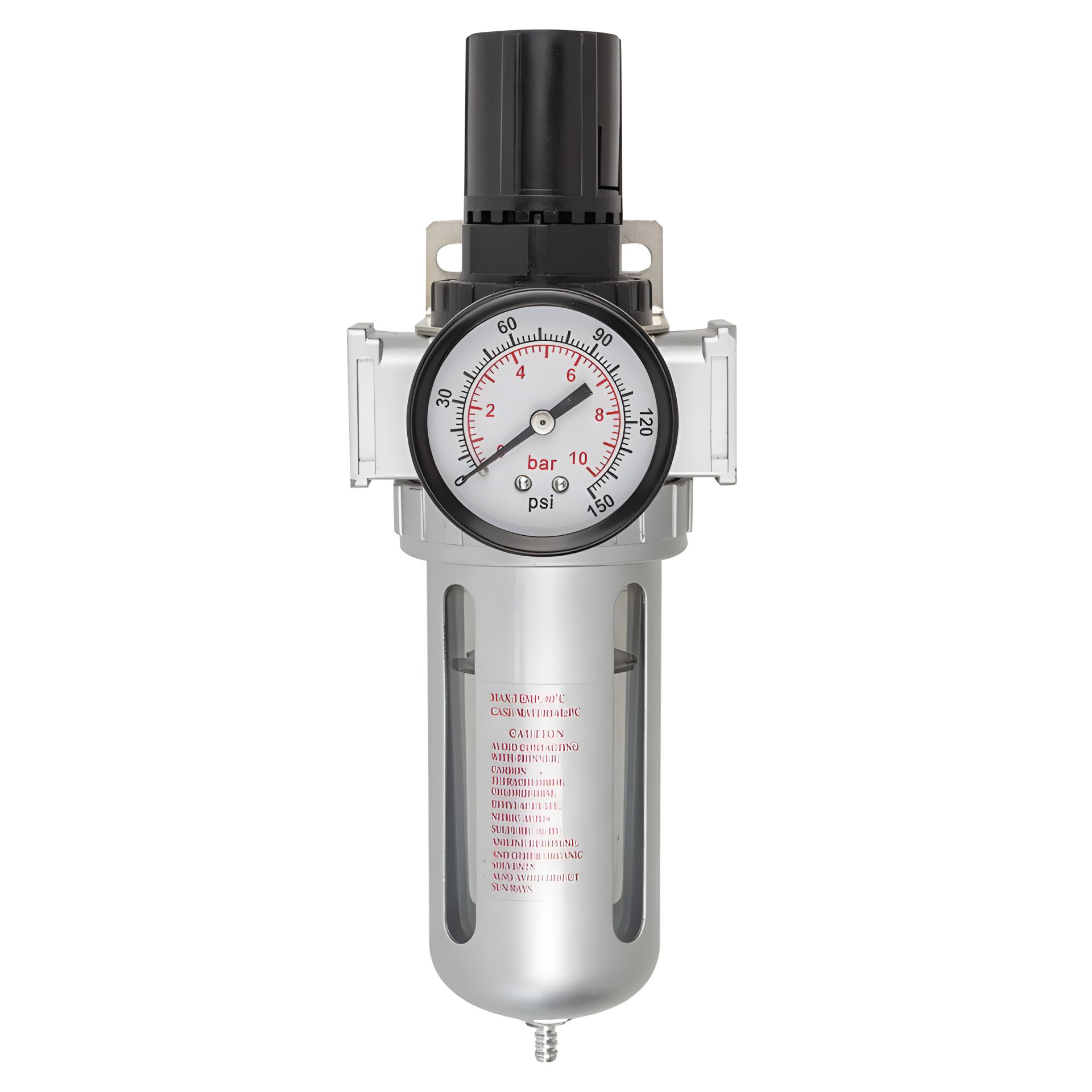 Фільтр-регулятор ROCKFORCE RF-AFR802 з приєднувальним розміром 1/4" і робочим тиском 10 бар має пропускну здатність 1500 л/хв і призначений для підготовки стиснутого повітря, що надходить від компресора: осушення та очищення від пилу та інших твердих частинок розміром від 10 м. роботи пневмоінструменту. Може експлуатуватися при температурі від 5°C до +60°C.