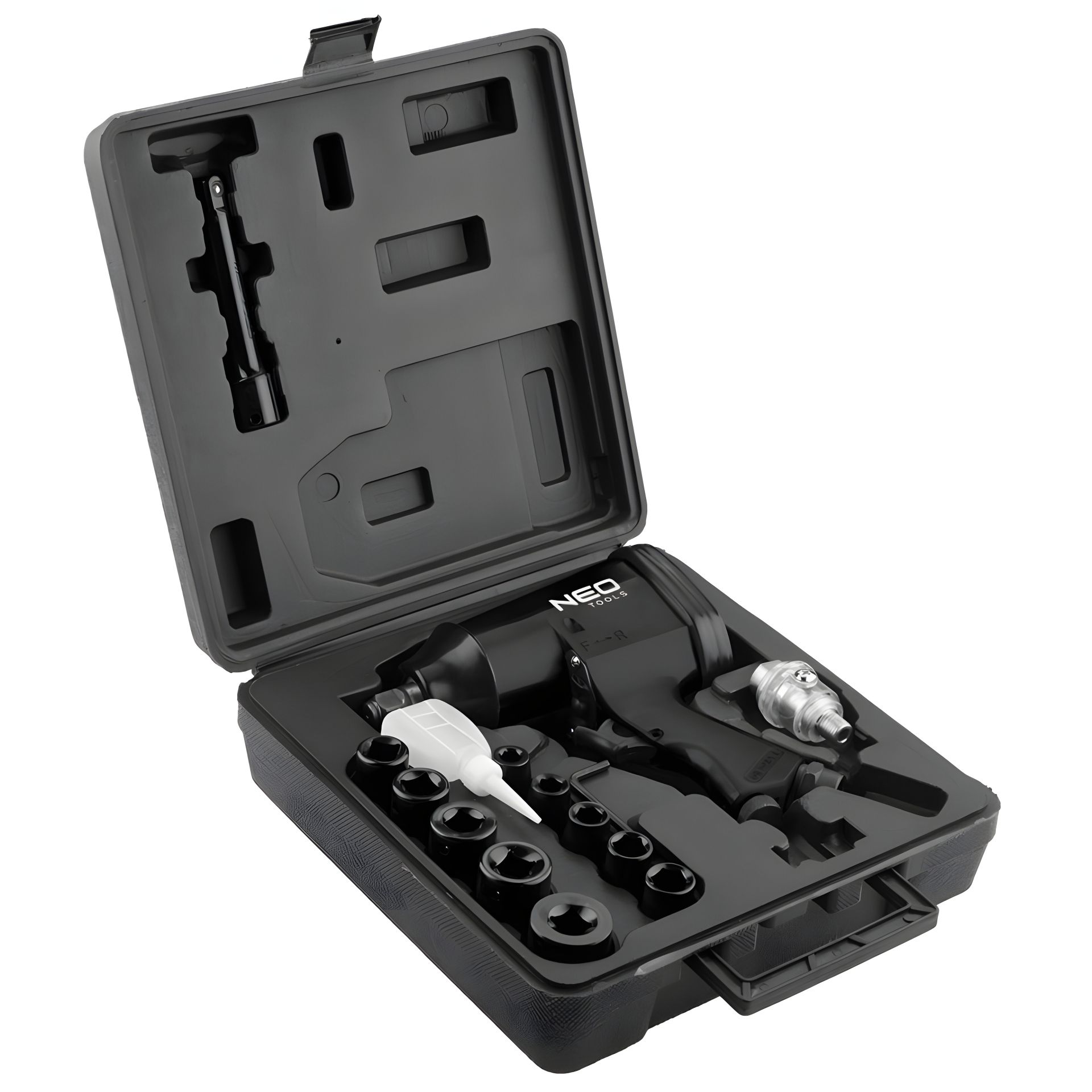 Гайковерт ударний пневматичний 1/2" NEO (арт. 14-502). Міцний, сталевий ударний гайковерт в комплекті зі змінними головками популярних розмірів від 9 до 27 мм, міні-масляною і подовжувачем. валіза. Відповідність європейським стандартам у сфері безпеки підтверджує сертифікат CE.