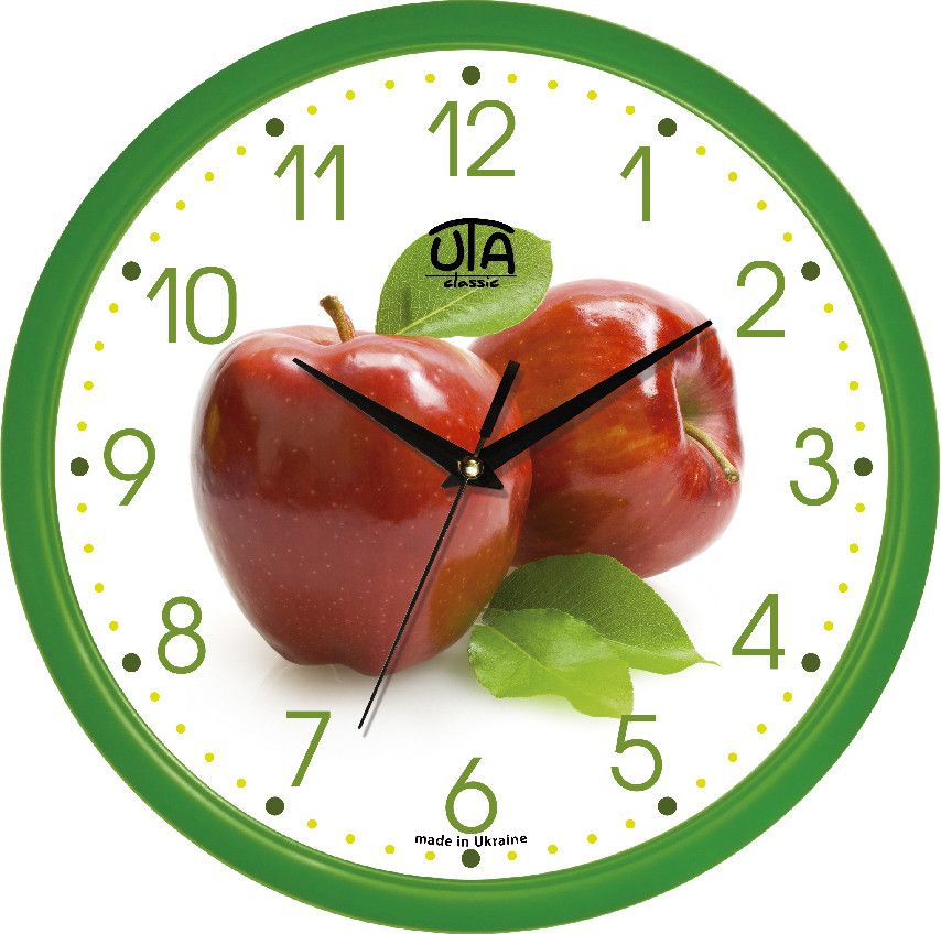 Настінний годинник на кухні штату Юта "класично" (30 SM) 01 Gr 68 "Яблука" характеризується круглою формою, діаметром 30 см, товщиною 4,5 см, вага 0,35 кг. Розроблений для позначення поточного часу за години та хвилини.