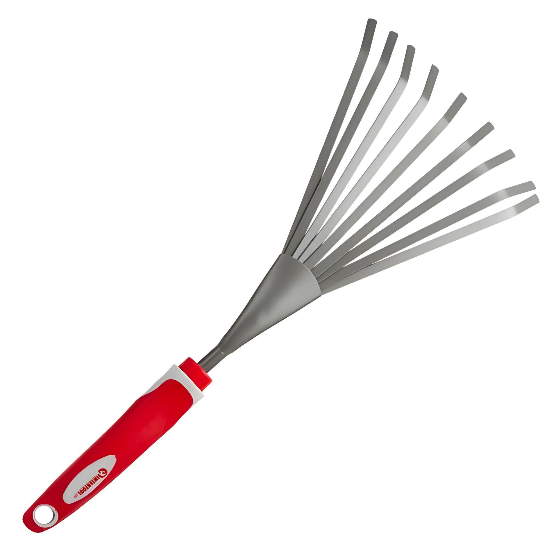 Така модель граблів виготовлена з надійної високоякісної сталі та вкрита антикорозійною фарбою, а місце стику прутків з ручкою посилено. Форма ручки повторює вигини долоні з підпальцевим упором, що гарантує максимум комфорту в роботі, а гумові вставки не дозволяють ковзати руці. Отвір на руків'ї допоможе вам зручно зберігати інструмент, підвісивши його на гачок.