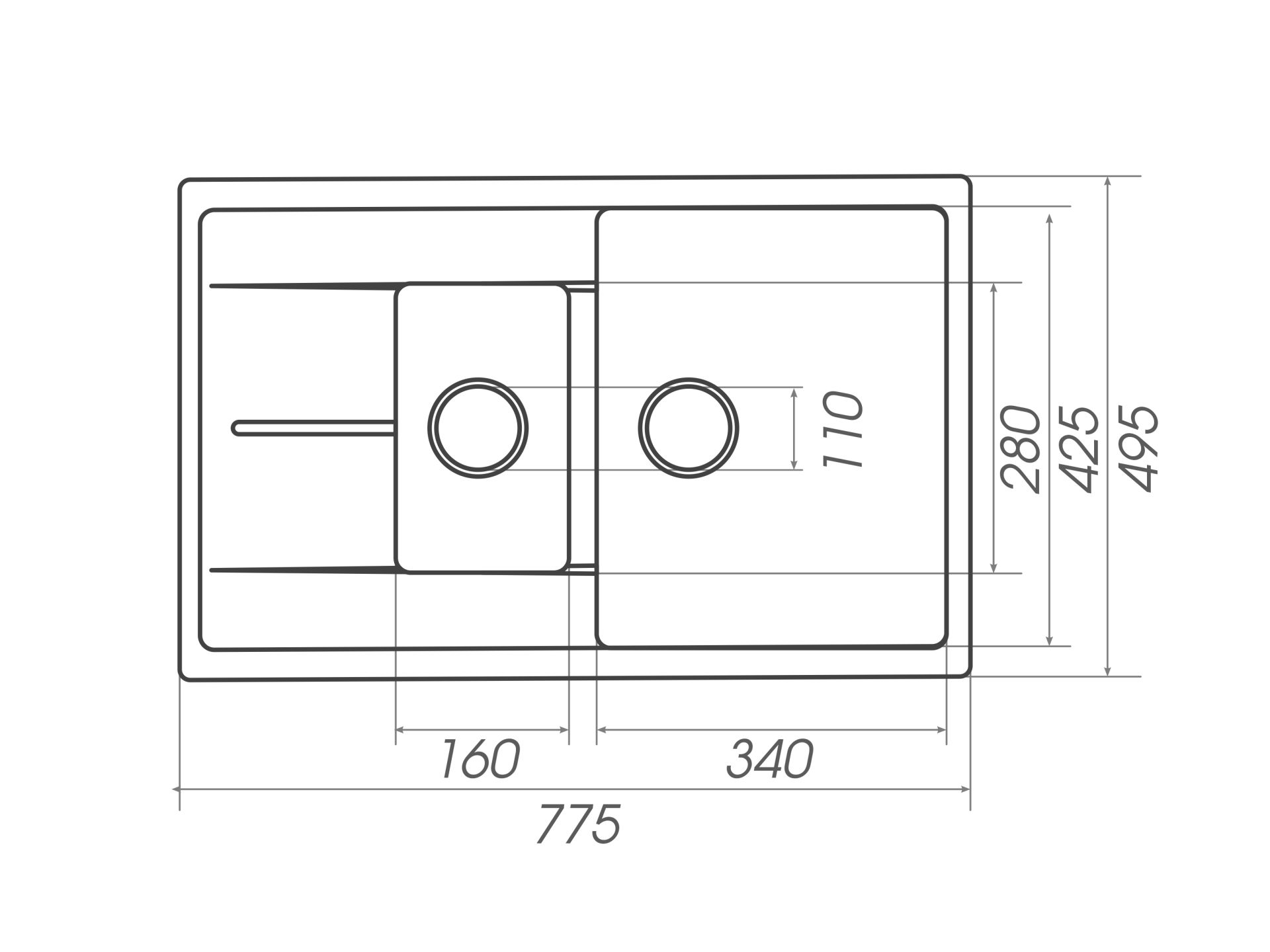Розміри мийки – 775х495х190 мм, вага – 14,2 кг, сифон – євросифон з широкою горловиною, 110 мм.