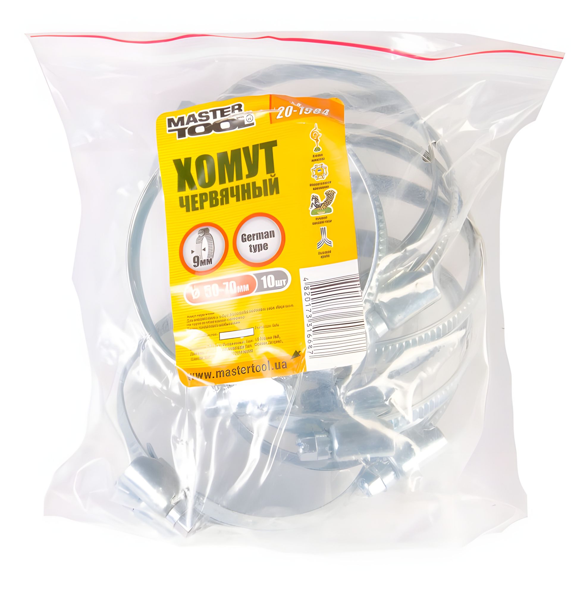 Набір черв'ячних хомутів German type W1 DIN 3017 9.0 мм Ø 50-70 мм (10 шт) від MASTERTOOL (20-1984)