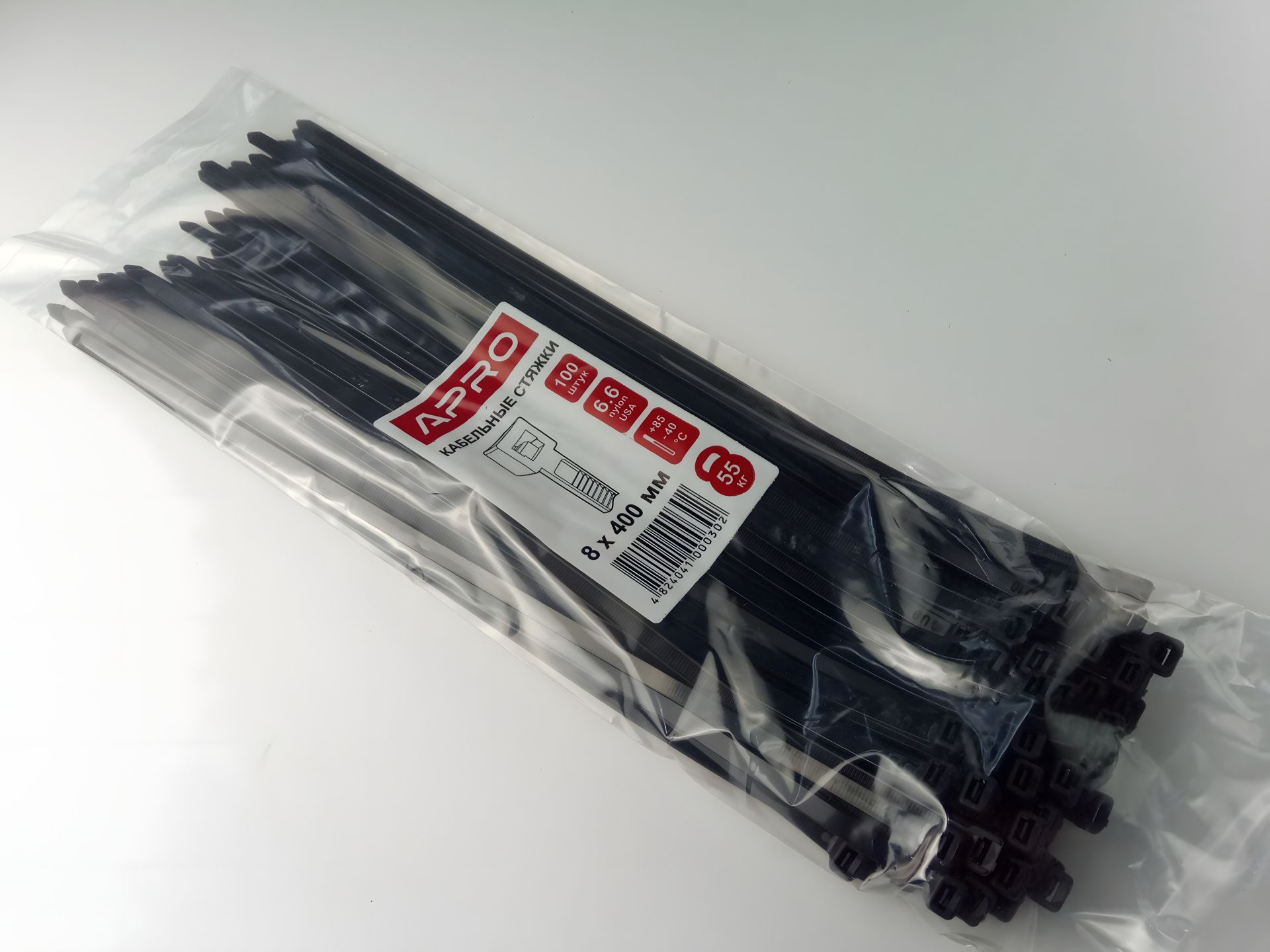 Пластикові хомути APRO 400х7,6 (100 шт.), чорні, 1 упаковка (CT-B8400)