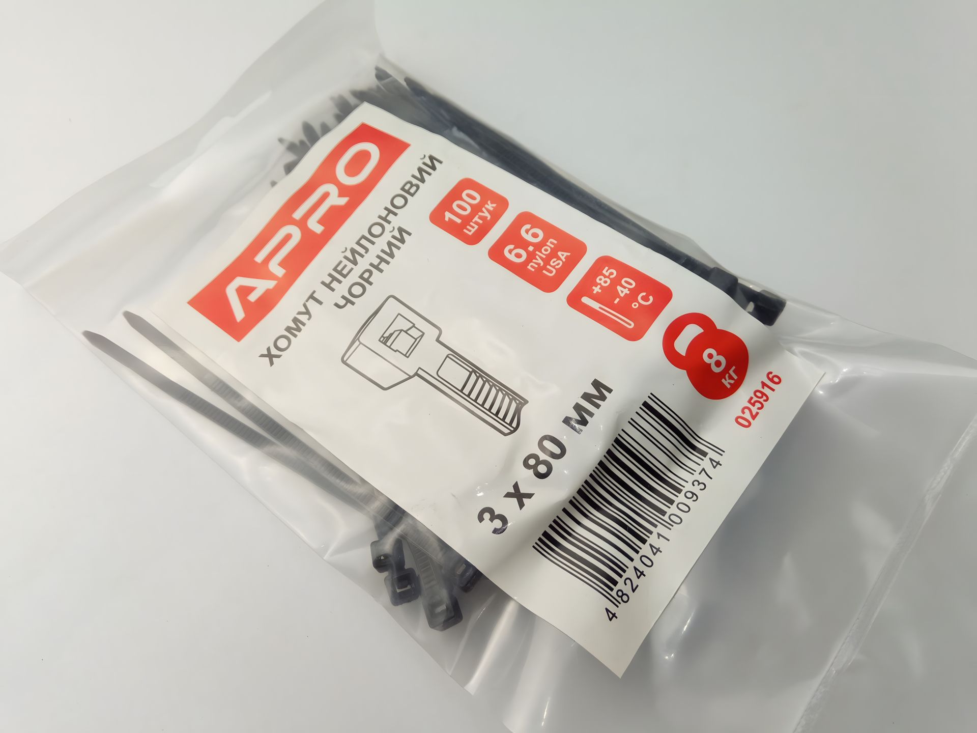 Пластиковий хомут APRO 80х3 (100 шт. в уп.), чорний, 1 УПАКОВКА (CT-B380)