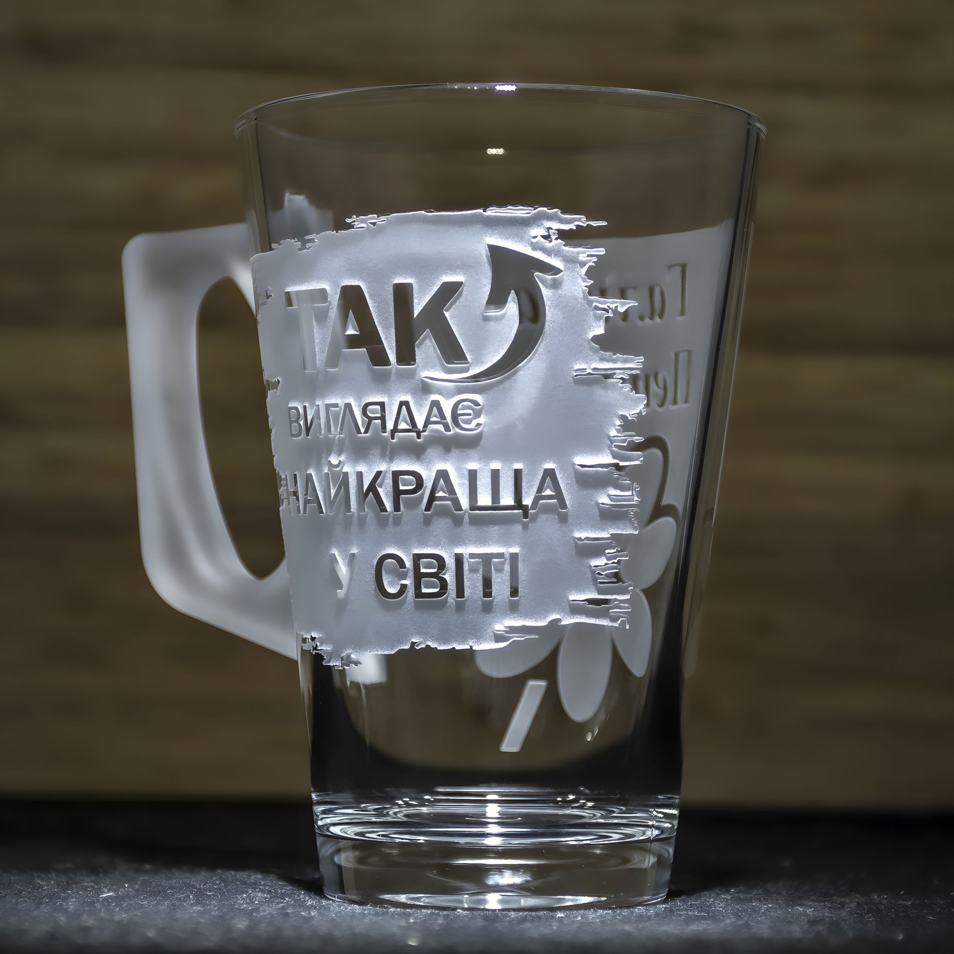 - Гравіювання з характером: Напис вигравіюваний не лазером, не є наліпкою або нафарбованим, а нанесений на скло з використанням особливої технології механічної обробки. Це створює відчуття рельєфу та об'ємності зображення, що надає чашці деякої чарівності.