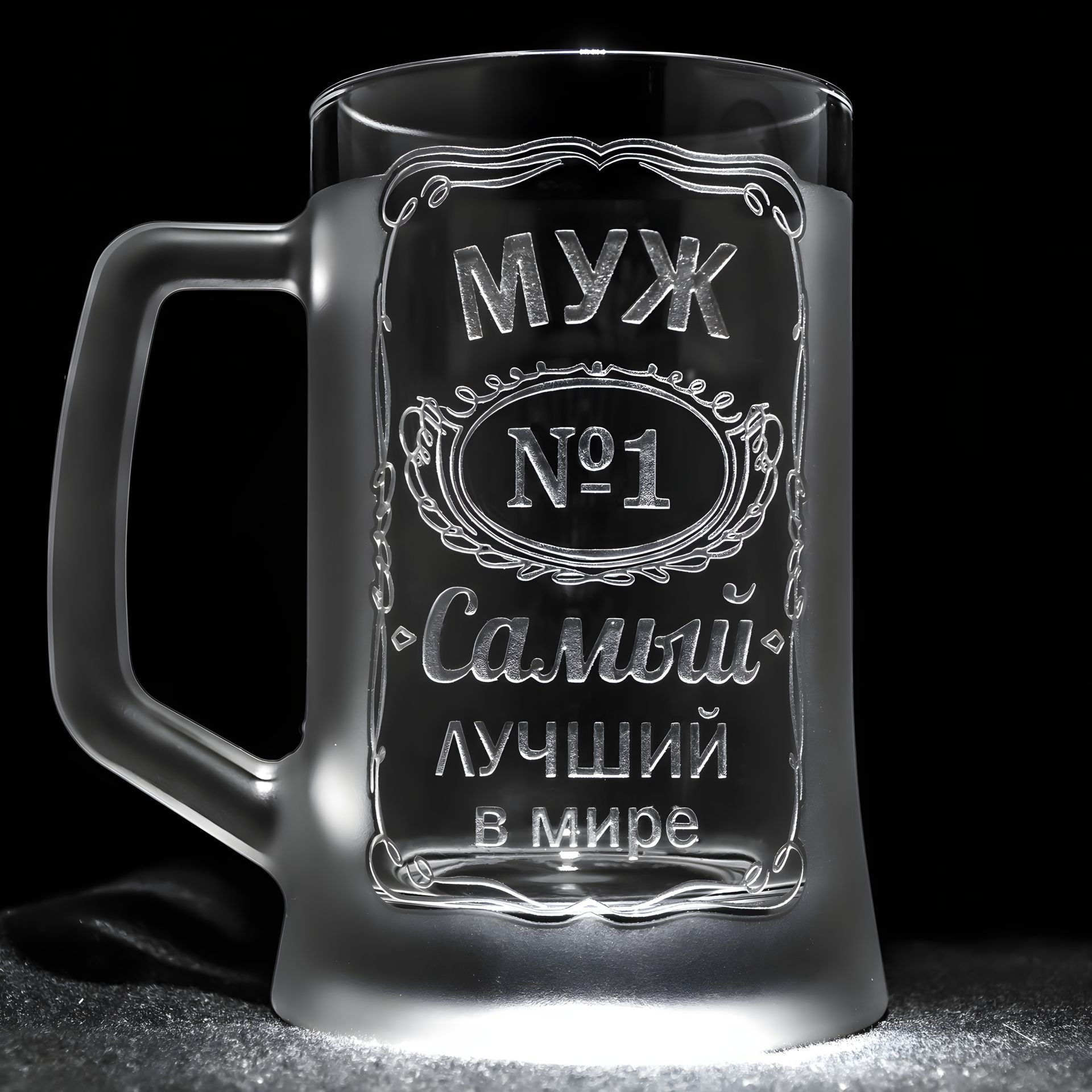 Бокал для пива з ручним механічним гравіюванням напису МУЖ №1 Самый лучший в мире, матовий у подарунковій коробці