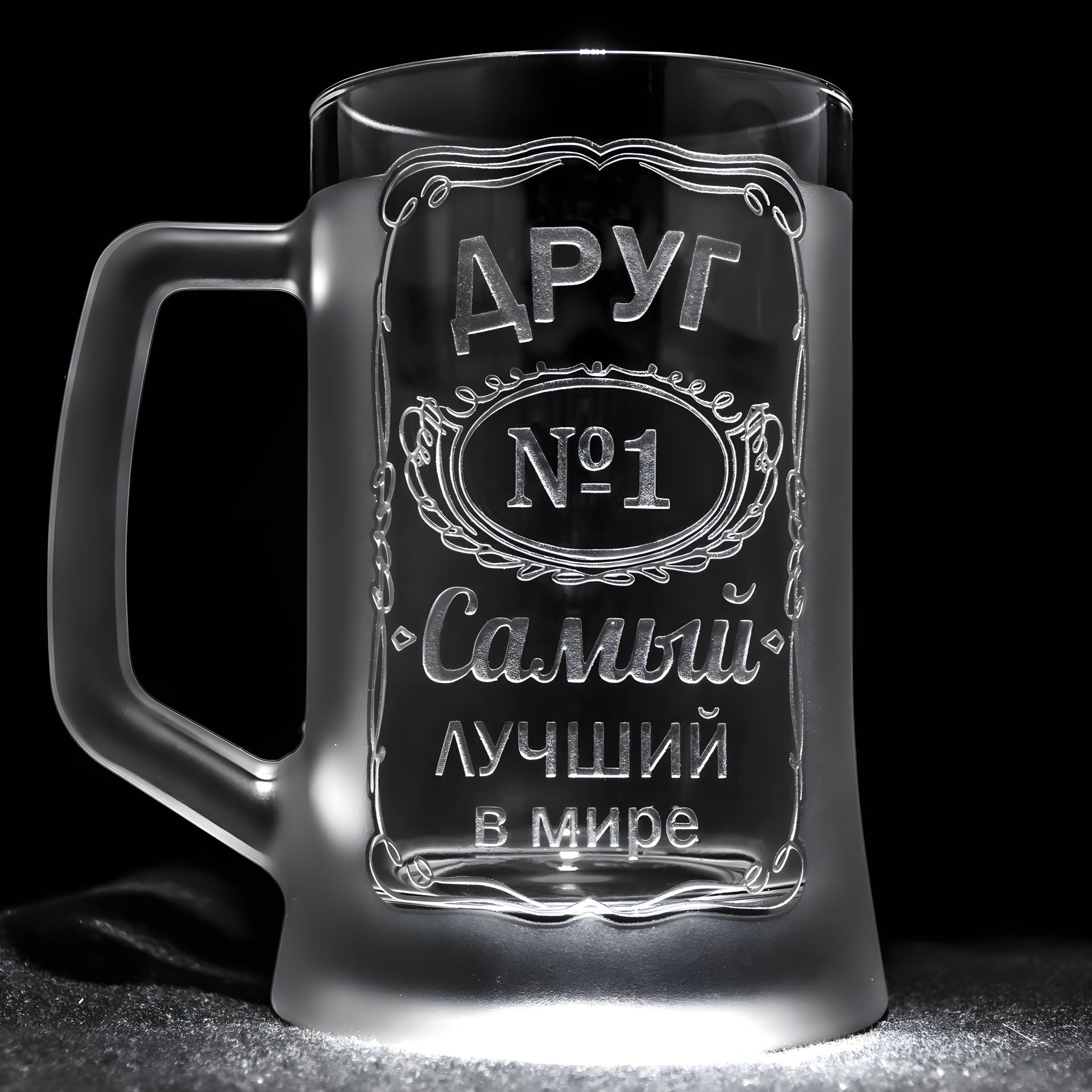 Бокал для пива з ручним механічним гравіюванням напису ДРУГ №1 Самый лучший в мире, матовий у подарунковій коробці