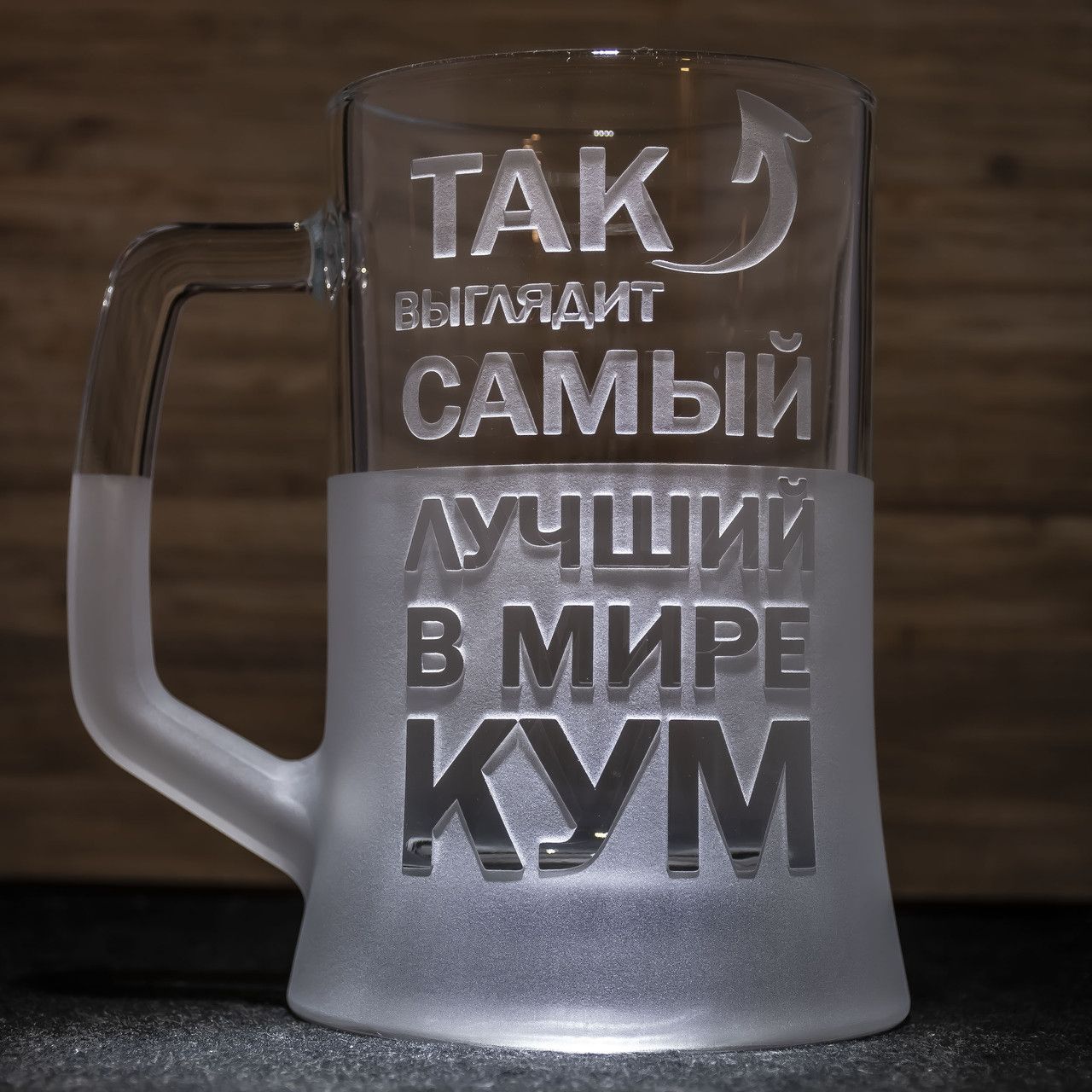 Скляний бокал для пива з ручним механічним гравіюванням напису "Так выглядит самый лучший в мире Кум" у подарунковій коробці