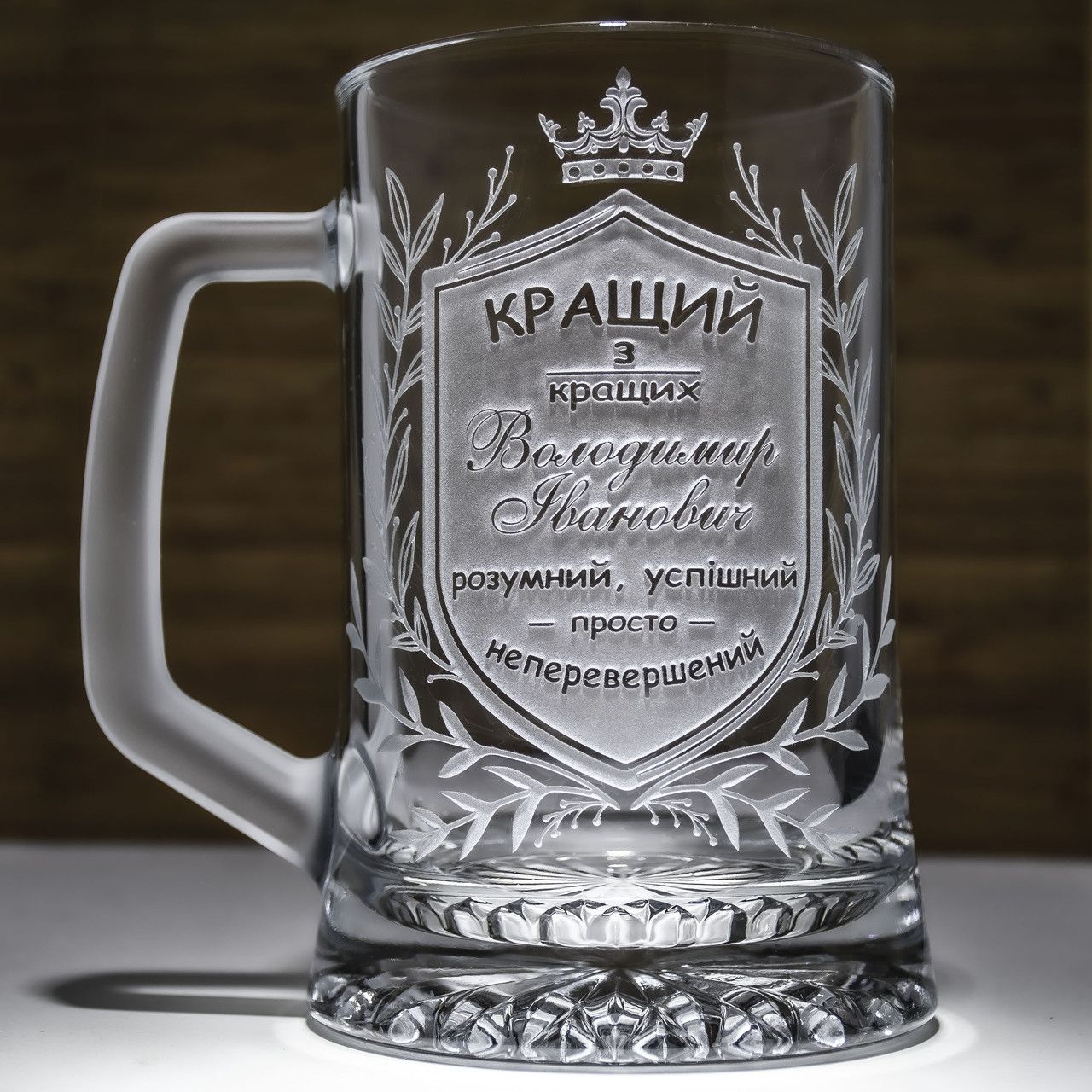 Кухоль для пива з механічним глибоким гравіюванням напису - привітання у подарунковій коробці