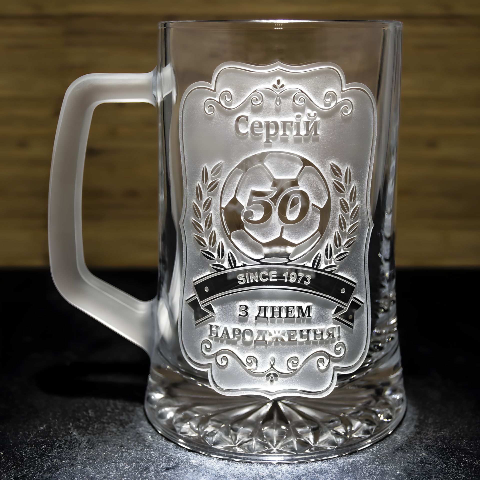 Іменний бокал для пива з гравіюванням імені і напису З Днем Народження з матовою ручкою - подарунок для футбольного вболівальника у подарунковій коробці