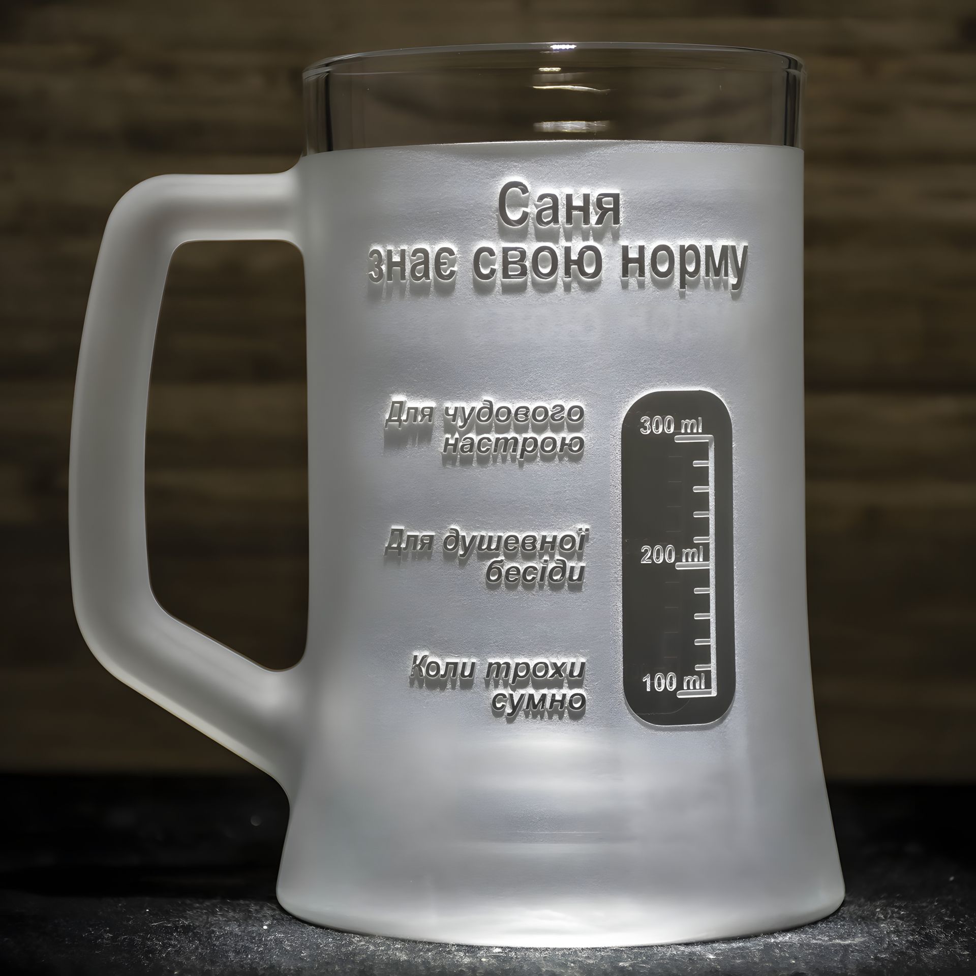 Пивний келих з іменною гравіюванням та матовою ручкою "Саня знає свою норму"