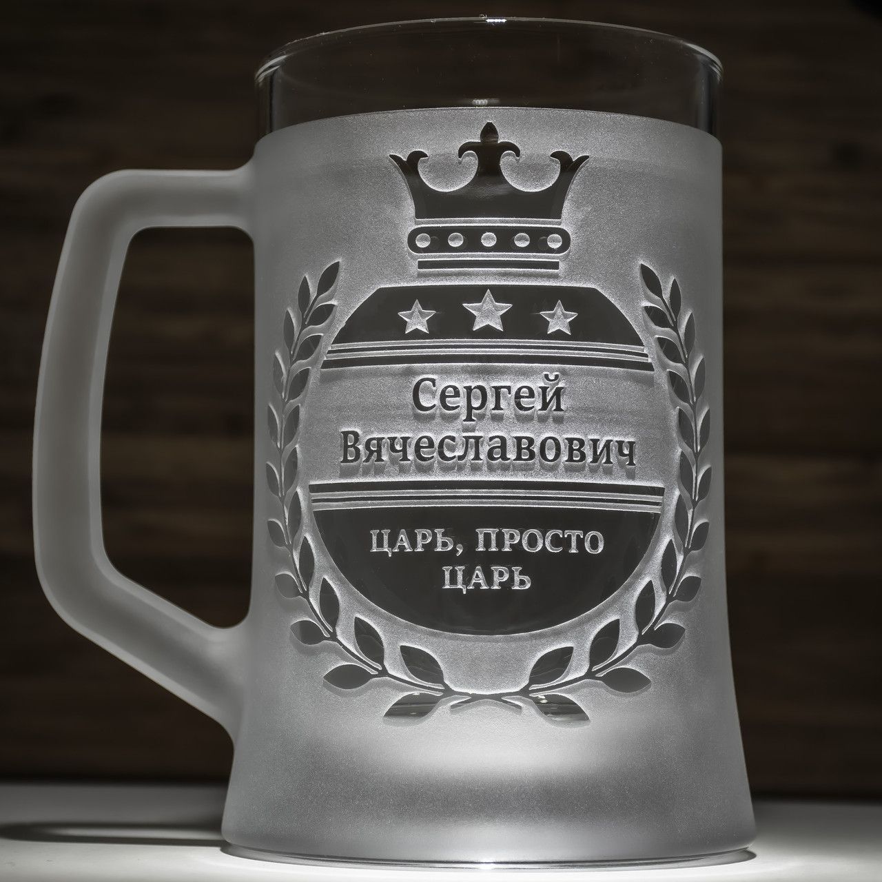 Кухоль для пива з ручним механічним гравіюванням напису "Цар, просто цар" матовий у подарунковій коробці