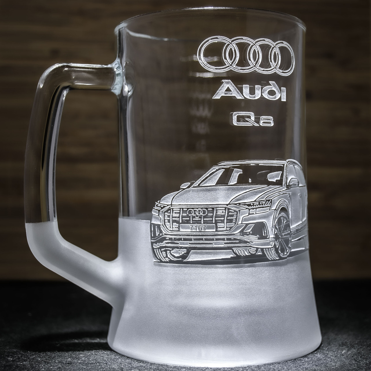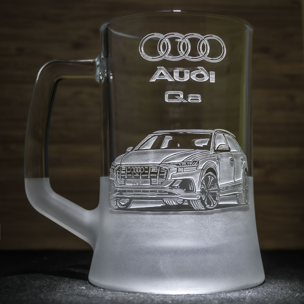Представляємо вам унікальну пивну кружку з гравіюванням зображення автомобіля Audi Q8 з матовою ручкою. Кружка є ідеальним подарунком для любителів марки Audi. Зображення нанесено на поверхню скла за допомогою методу гравіювання, який має безліч переваг.
