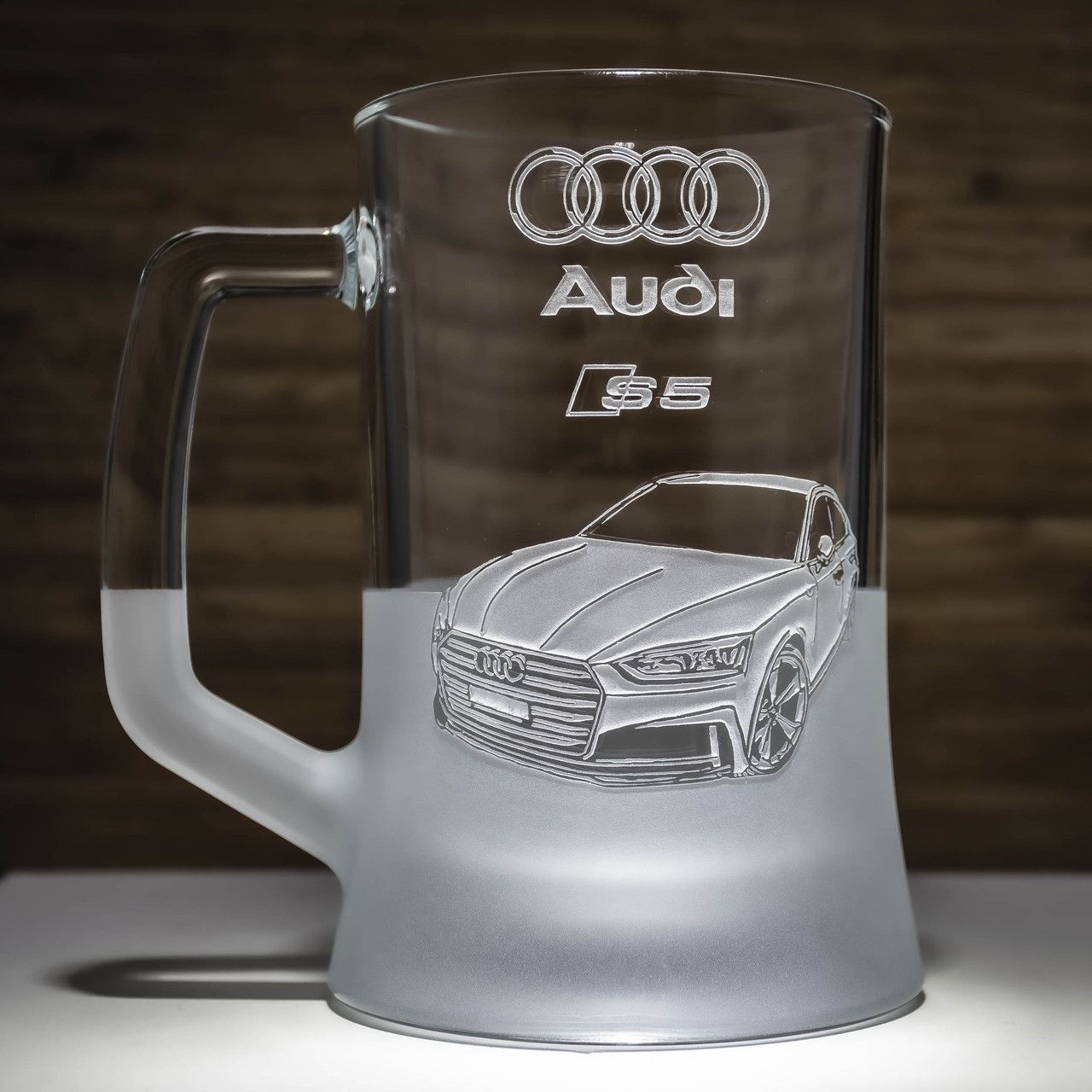 Cкляний кухоль для пива з ручним механічним гравіюванням Audi S5 у подарунковій коробці