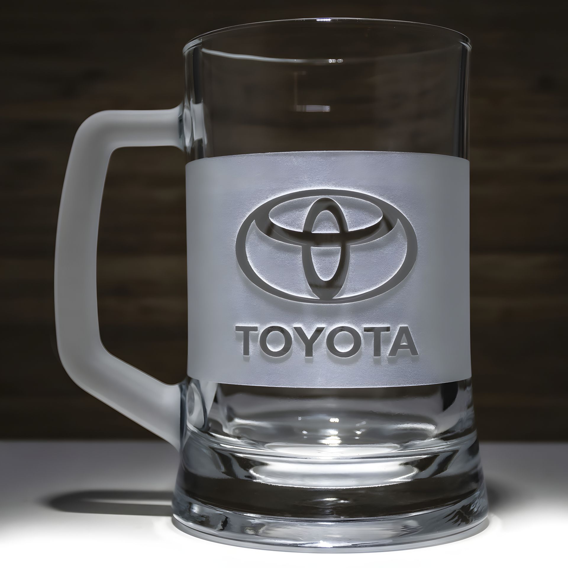 Cкляний кухоль для пива з ручним механічним гравіюванням логотипу Toyota у подарунковій коробці
