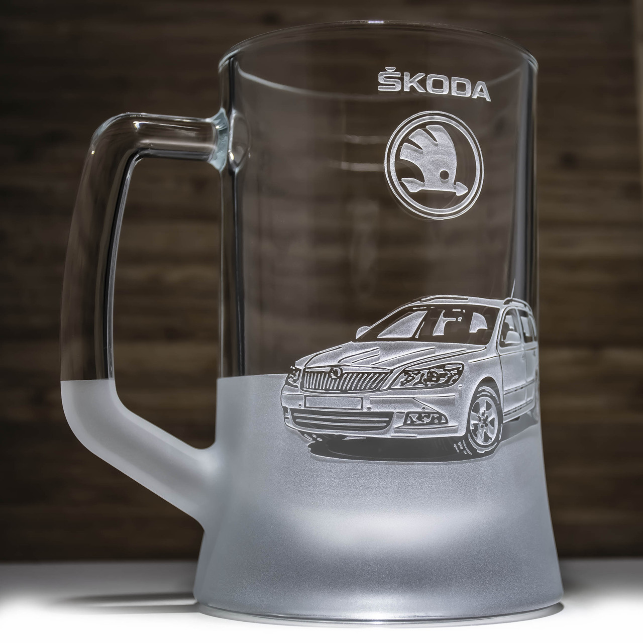 Сувенірний скляний кухоль для пива з ручним механічним гравіюванням SKODA Octavia в кузові універсал у подарунковій коробці