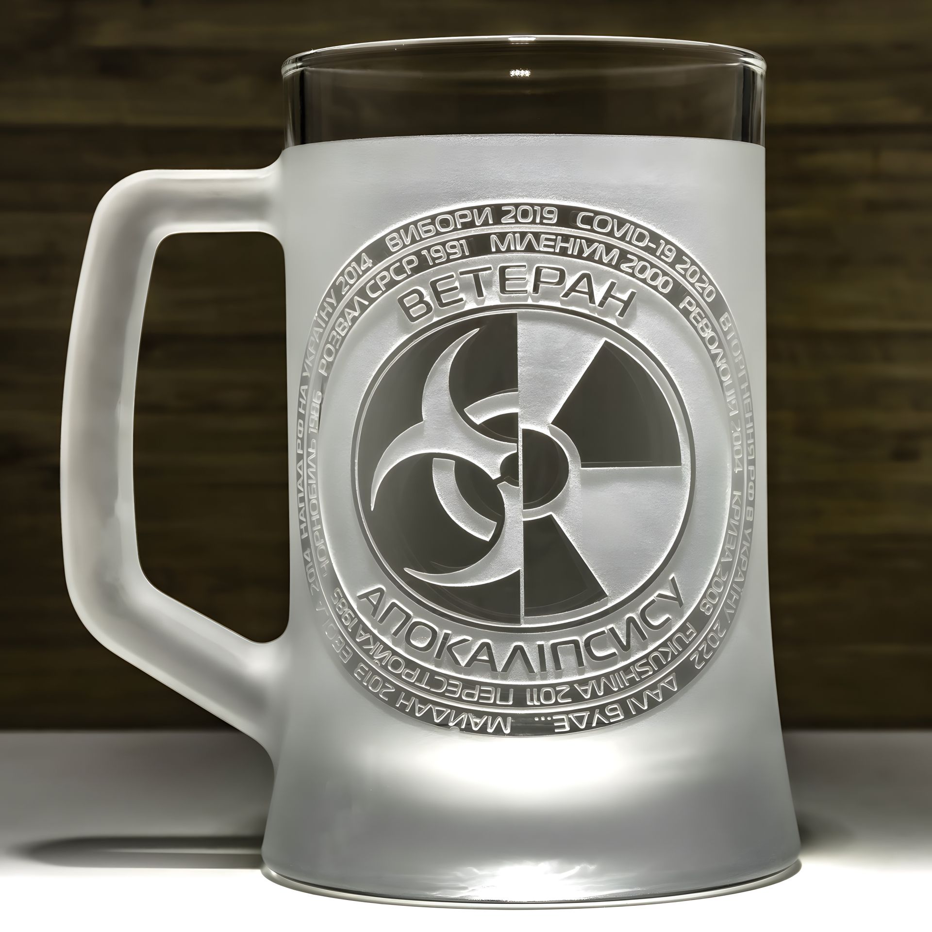 Кухоль для пива з ручним механічним гравіюванням Ветеран апокалипсису, матовий у подарунковій коробці