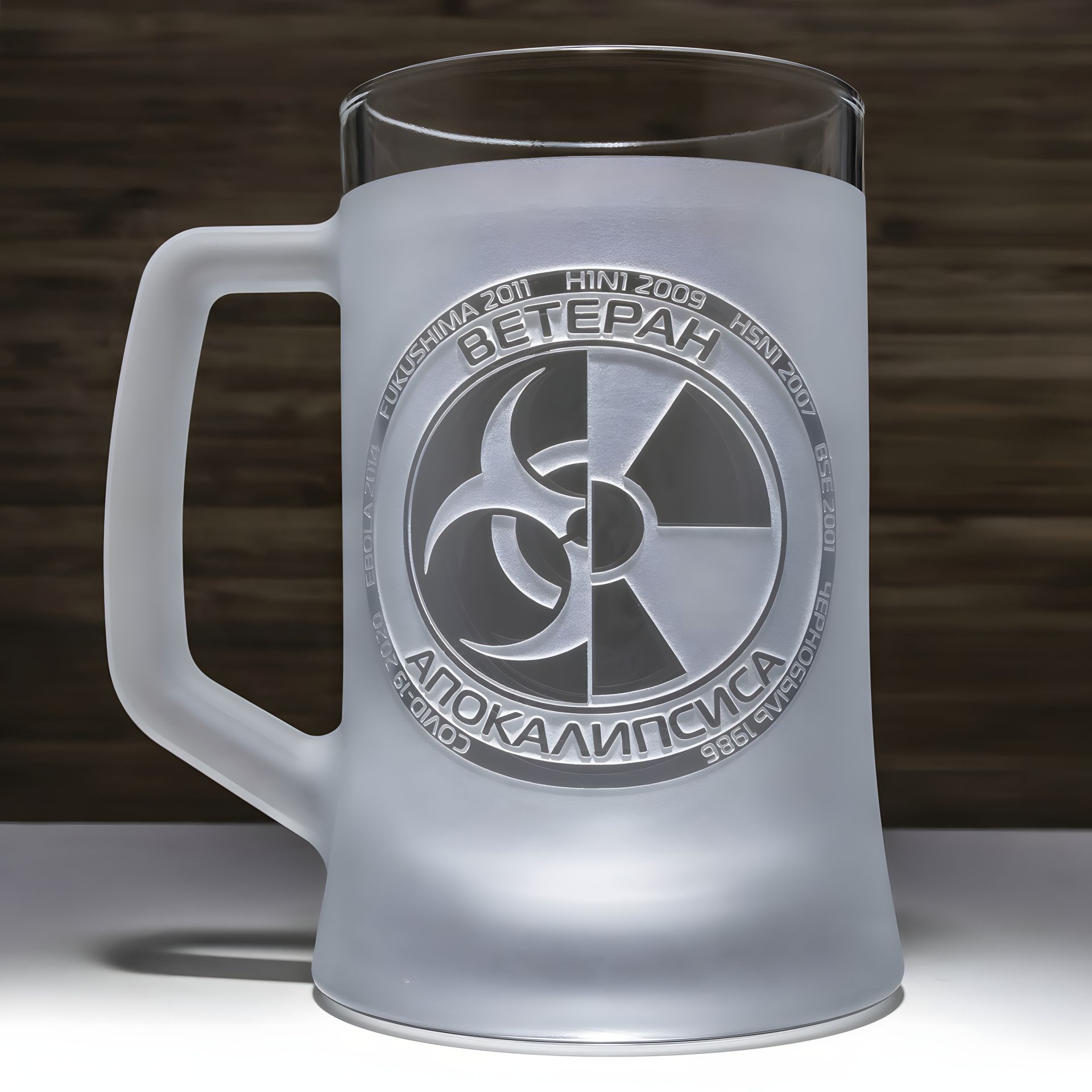 Кухоль для пива з ручним механічним гравіюванням Ветеран апокалипсису, матовий у подарунковій коробці