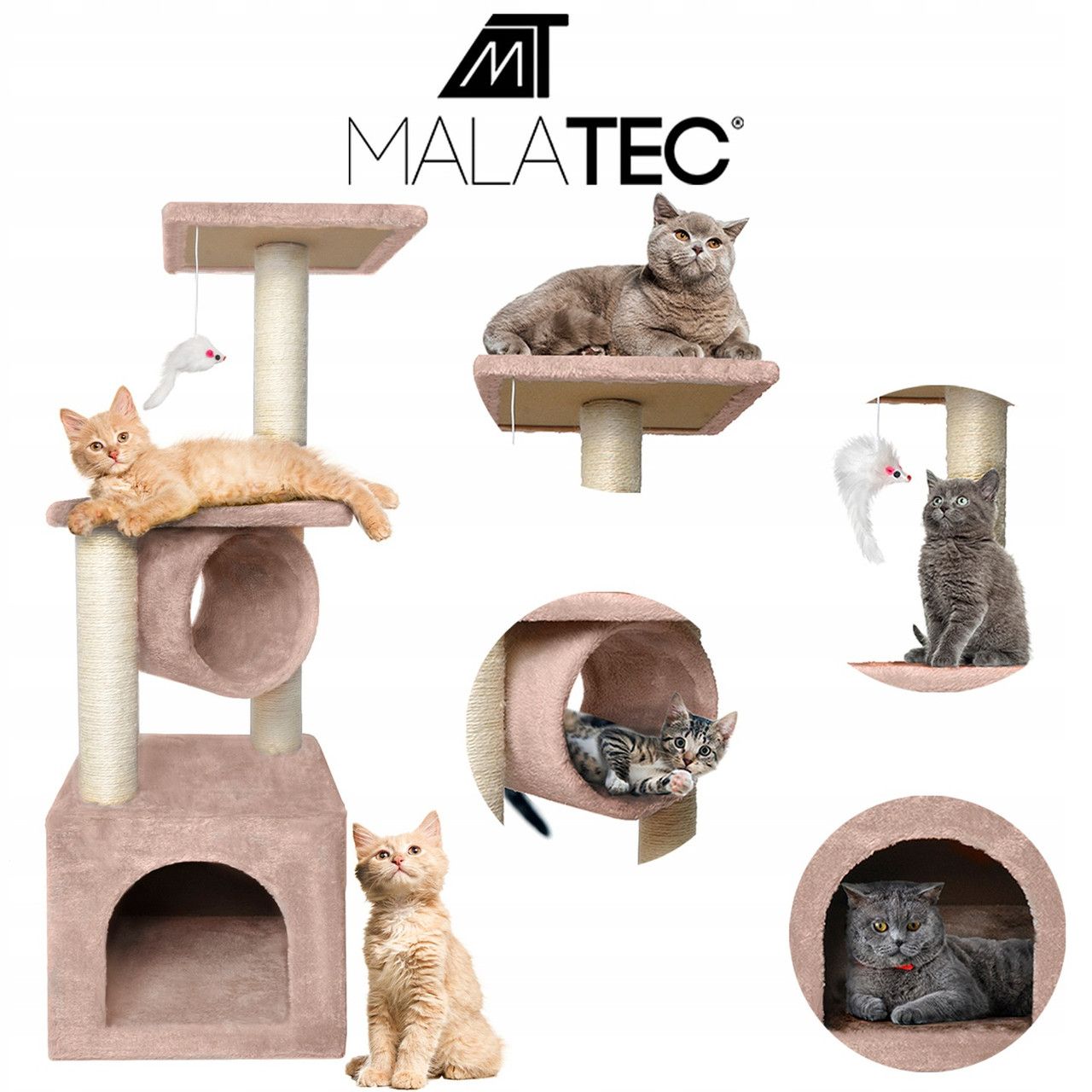 Підлоги котячої кігтеточки покриті дуже м'яким хутром, що гарантує комфортний відпочинок з муркотінням на задньому плані. Головна перевага дерева – затишний будиночок. Додатковий варіант для релаксації – трубка, розміщена на 3-му рівні кігтеточки. Кошеня зможе вільно відпочивати. 5 рівнів спостереження задовольнять котячу цікавість. У разі нудьги можна полювати на мишку, закріплену на гумці, яка знаходиться на 4-му поверсі кігтеточки - її можна зловити і атакувати.