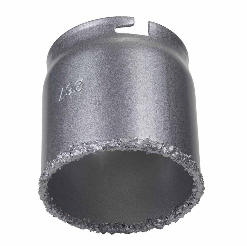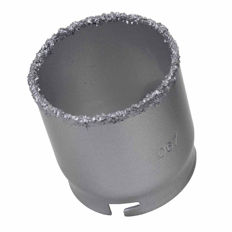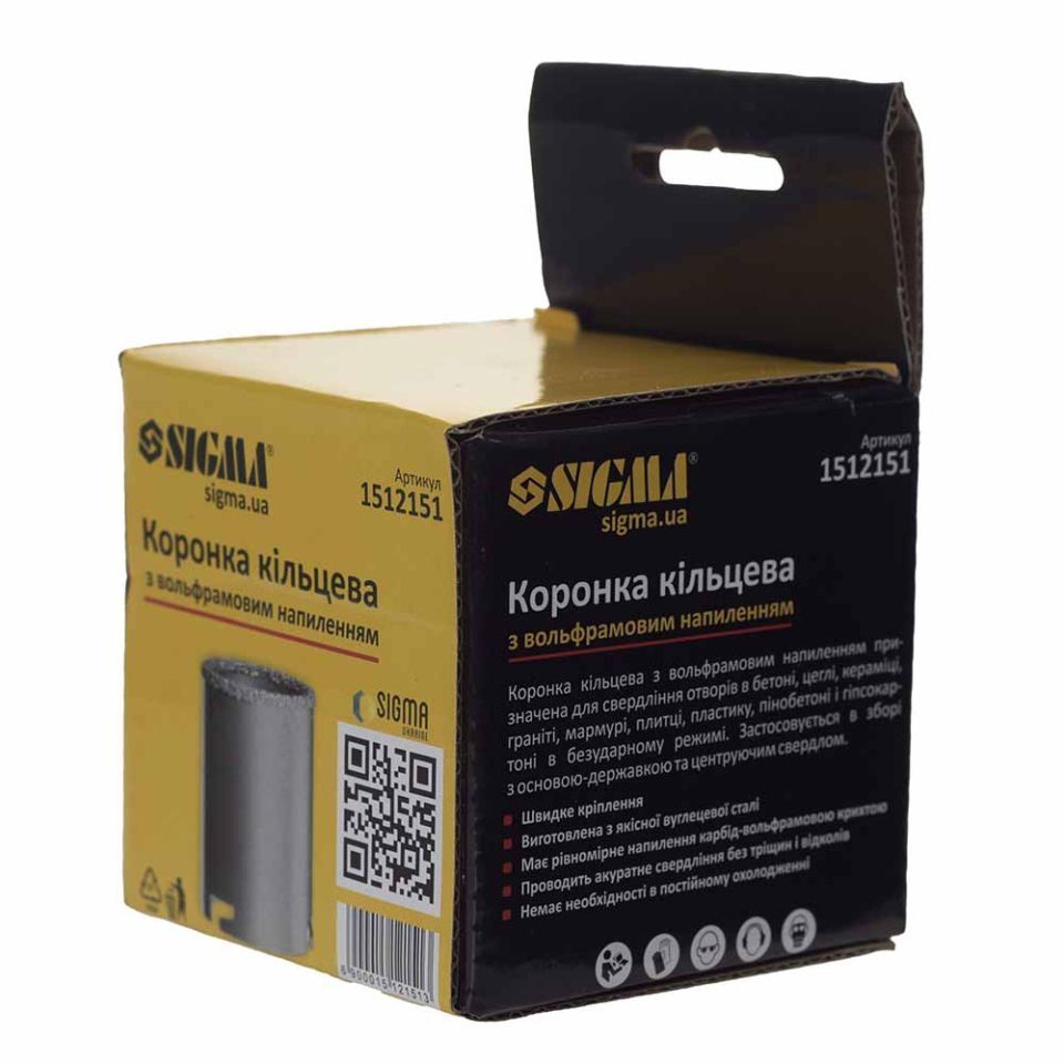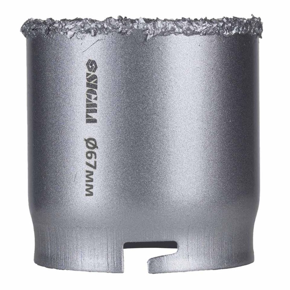Коронка кільцева з вольфрамовим напиленням 67мм SIGMA (1512151) призначена для свердління отворів у бетоні, цегли, кераміці, граніті, мармурі, плитці, пластику, пінобетоні та гіпсокартоні в ненаголошеному режимі.