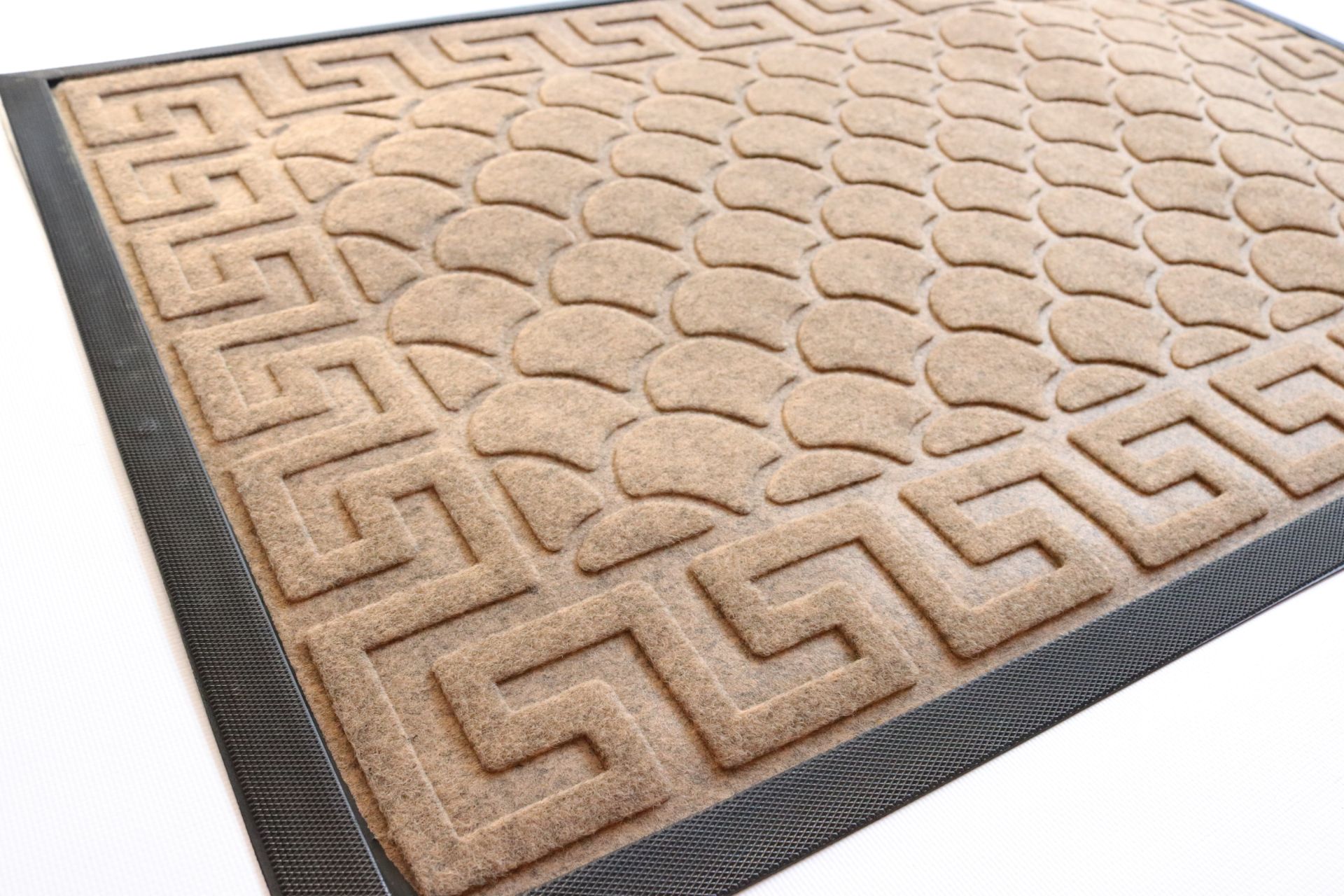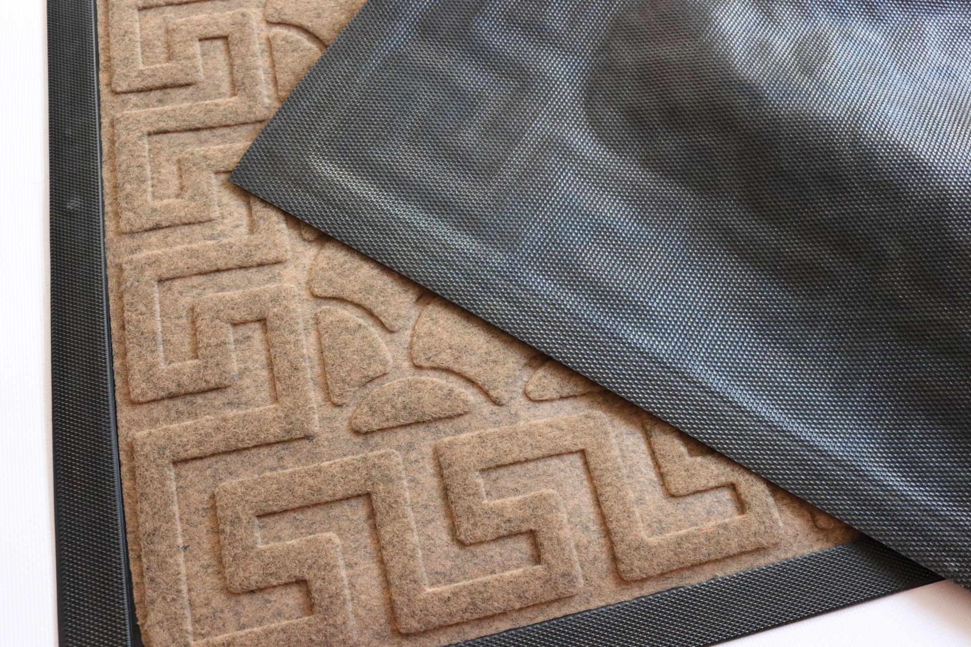 Килимок вхідний велюровий має борт по краю, який запобігає витіканню води. З нижнього краю нанесена гумова основа, яка зменшує ковзання та не пропускає воду на підлогу.