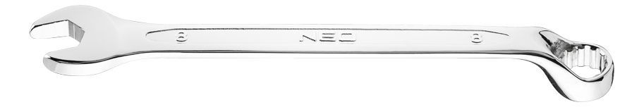 Ключ комбінований NEO 8 мм, із відігнутою кільцевою головкою SPLINE. Відкритий зів ключа профільований, що під час роботи забезпечує цілих 4 точки зіткнення з гвинтом або шестигранною гайкою. Краще припасування відкритого зіва зменшує ризик зісковзування інструменту. Чотири пункти зіткнення - це можливість застосування більшої сили без небезпеки пошкодити гайку або головку гвинта (також у випадках, якщо елемент, що відкручується, частково пошкоджений або невисокої якості). Кільцева головка SPLINE – це гарантія багатопрофільного використання ключа, його спеціальна конструкція дозволяє працювати з різними видами гвинтів (квадратними, шестигранними, дванадцятигранними, Torx, SPLINE). Спеціальна відігнута частина дозволяє виконувати роботу у важкодоступних місцях та покращує захоплення інструменту. Ключ виконаний відповідно до стандарту DIN 3113, гарантує якість, ефективність та міцність. Високоякісна хромованадієва сталь забезпечує багаторічну надійність інструменту. Поліроване покриття полегшує очищення. Надійність продукту підтверджує гарантія 25 років. Бренд NEO відповідає вимогам професіоналів.