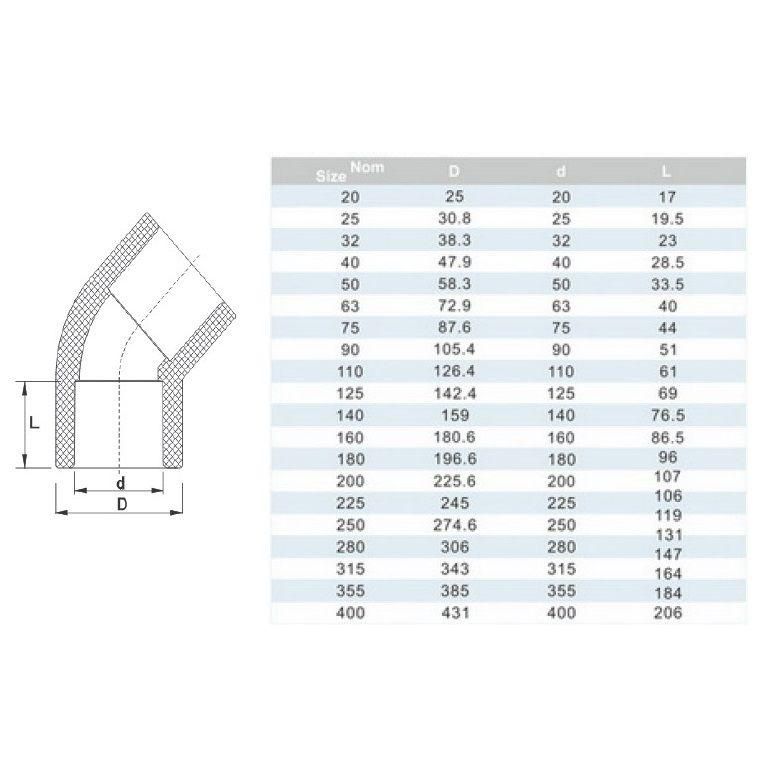 Коліно має кут повороту 45 градусів і сірий колір. Для з'єднань з трубами використовується спеціальний ПВХ клей. Перед наклеюванням поверхню труби знежирюють, змащують клеєм, стики з'єднуються, провертають, тримаємо 30 секунд - готово.